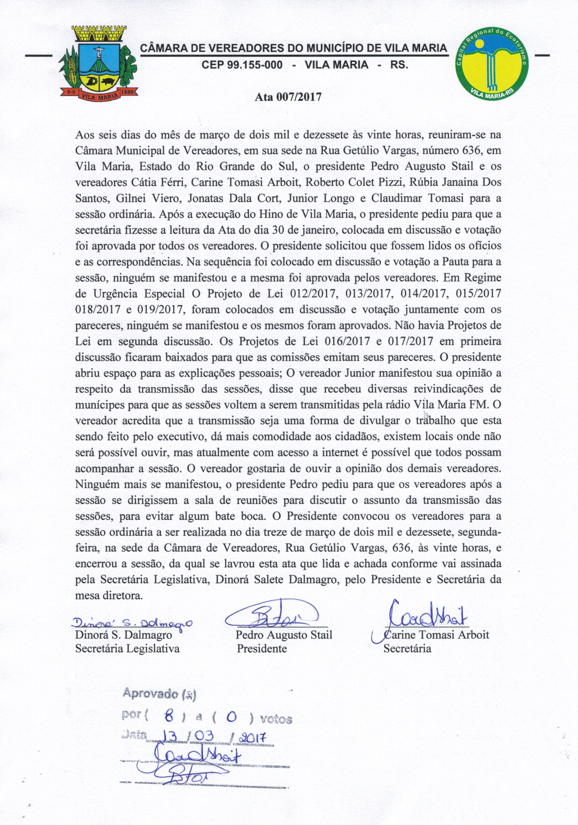 • A Ata 007/2017 da sessão do dia 06/03/2017 foi aprovada por todos os vereadores na sessão do dia 13/03/2017.