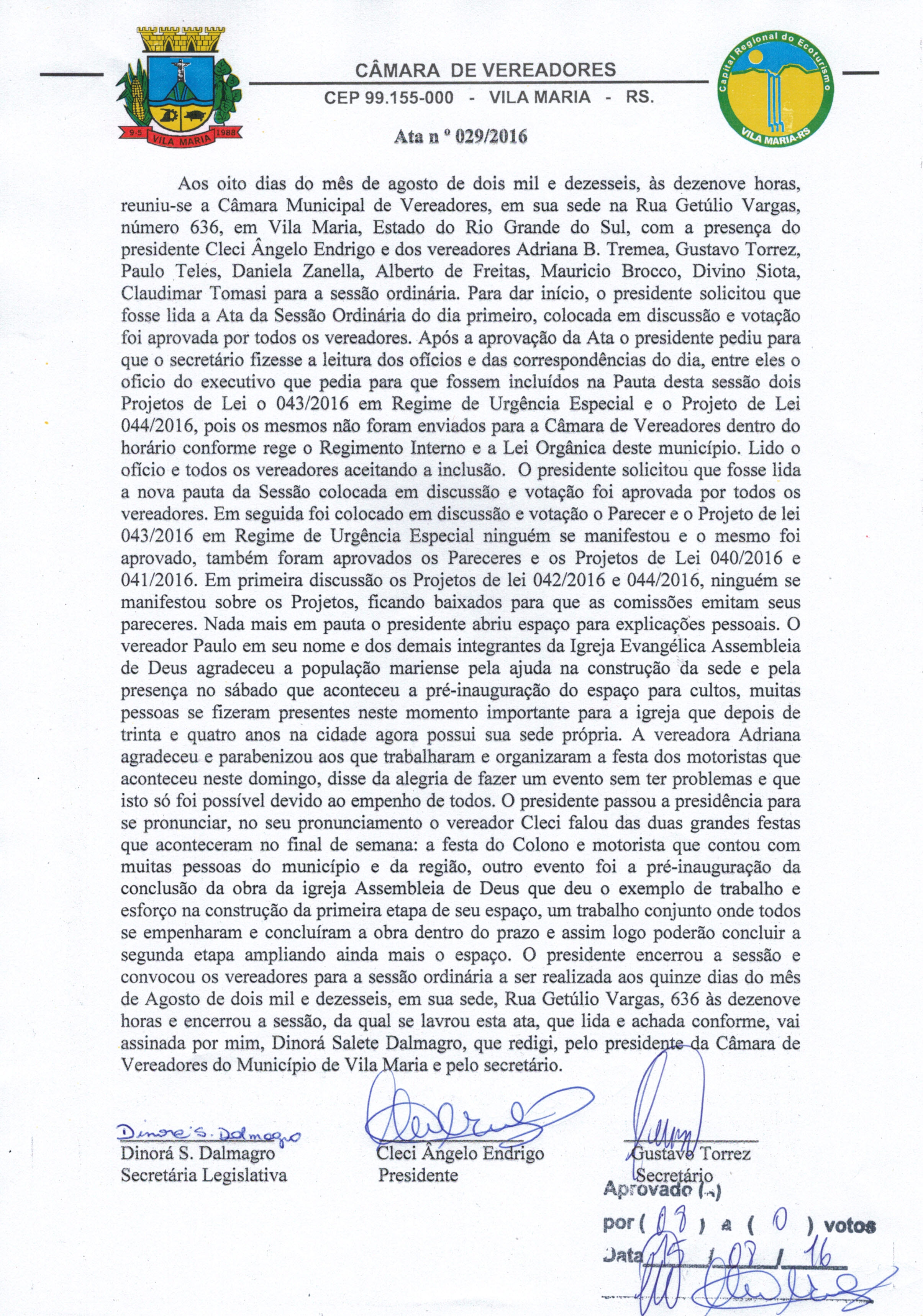• Ata 029/2016 do dia 08/08/2016, aprovada na sessão do dia 15/08/2016