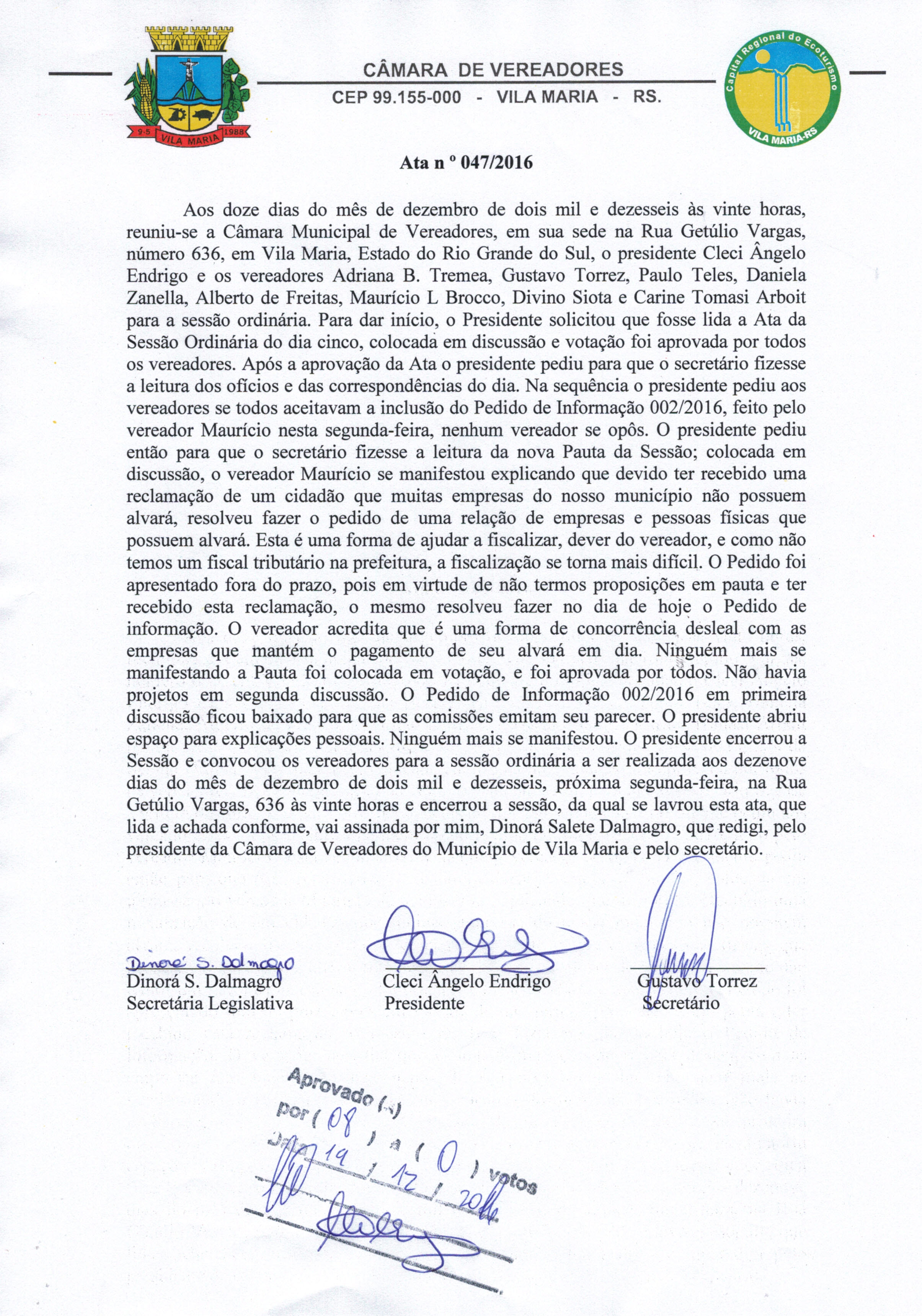 • Ata 047/2016 da sessão do dia 12/12/2016, aprovada na sessão do dia 19/12/2016.