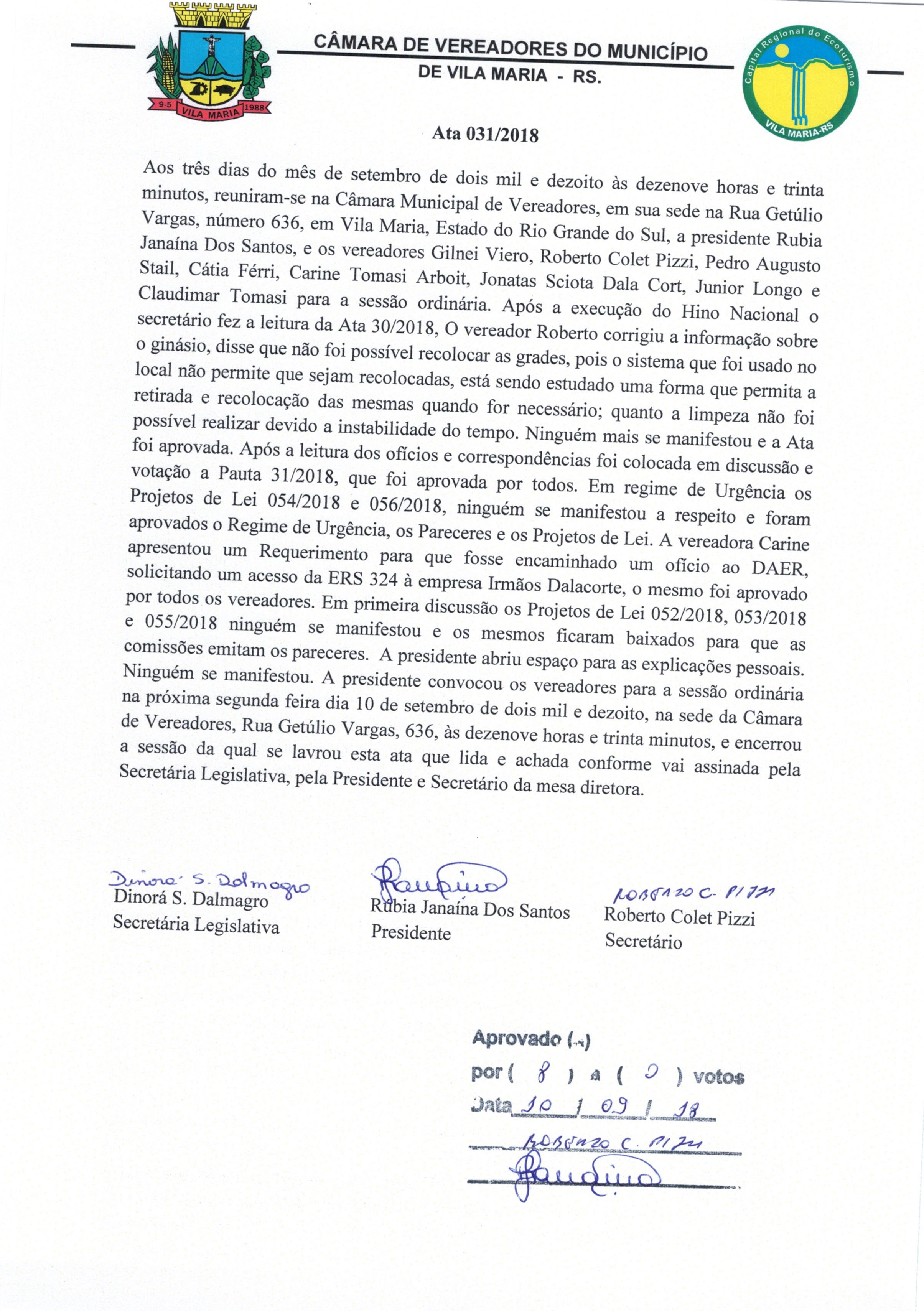 • Ata 31/2018 da sessão do dia 03/09/2018 foi aprovada por todos os vereadores.