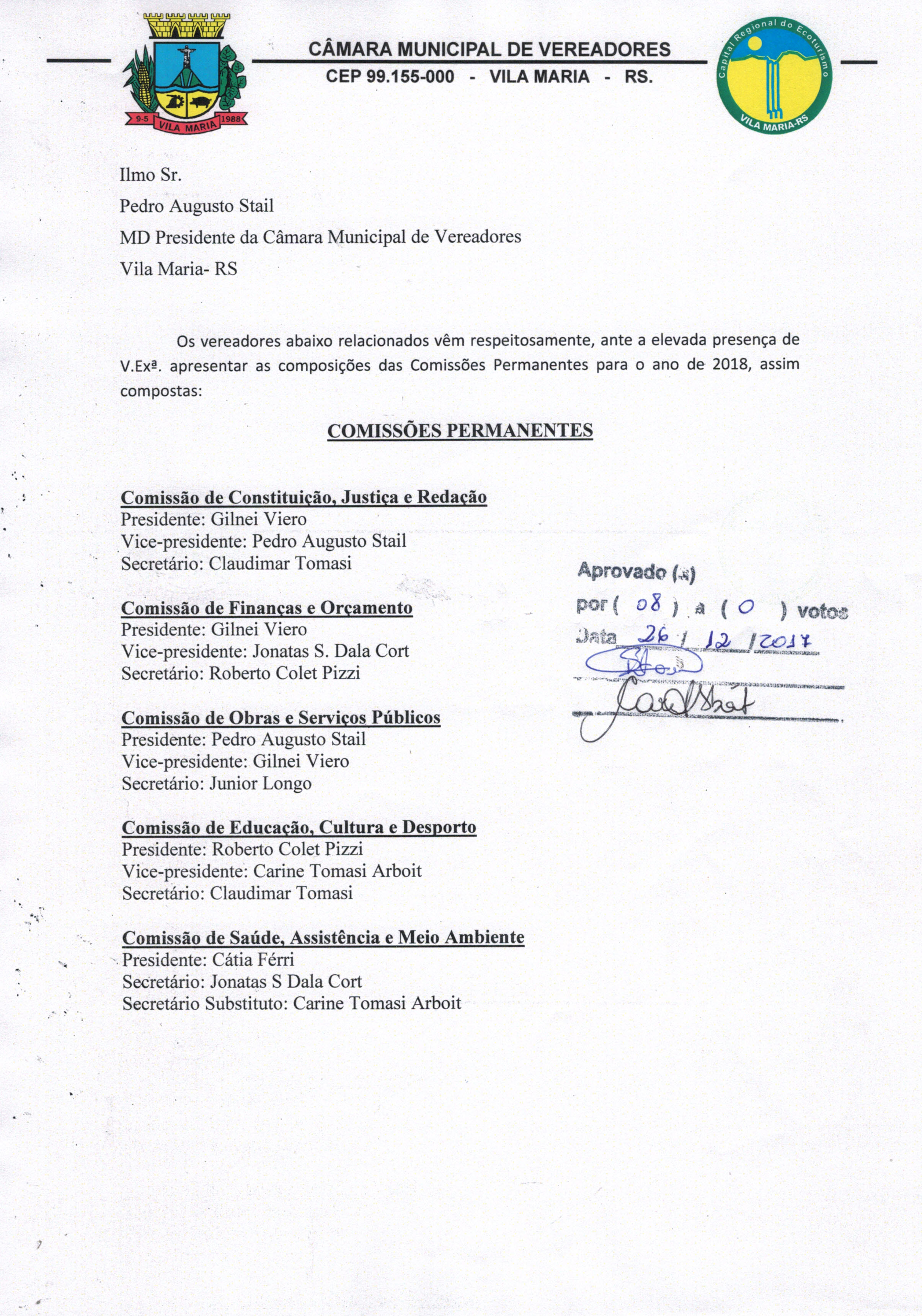 • As comissões permanentes foram escolhidas por aclamação na sessão do dia 26/12/2017.