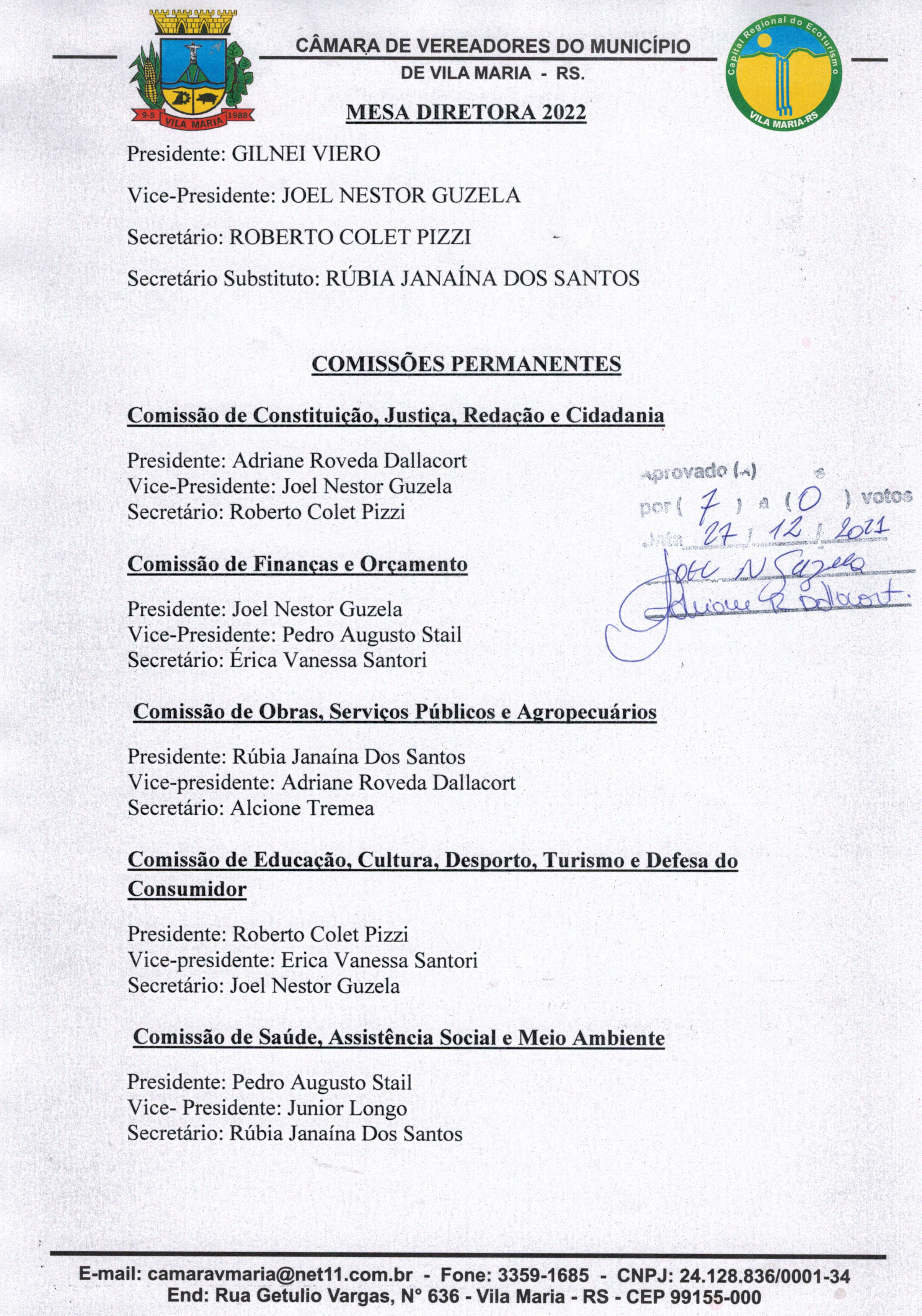 • Comissões permanentes escolhidas por aclamação e aprovadas por todos os vereadores presentes