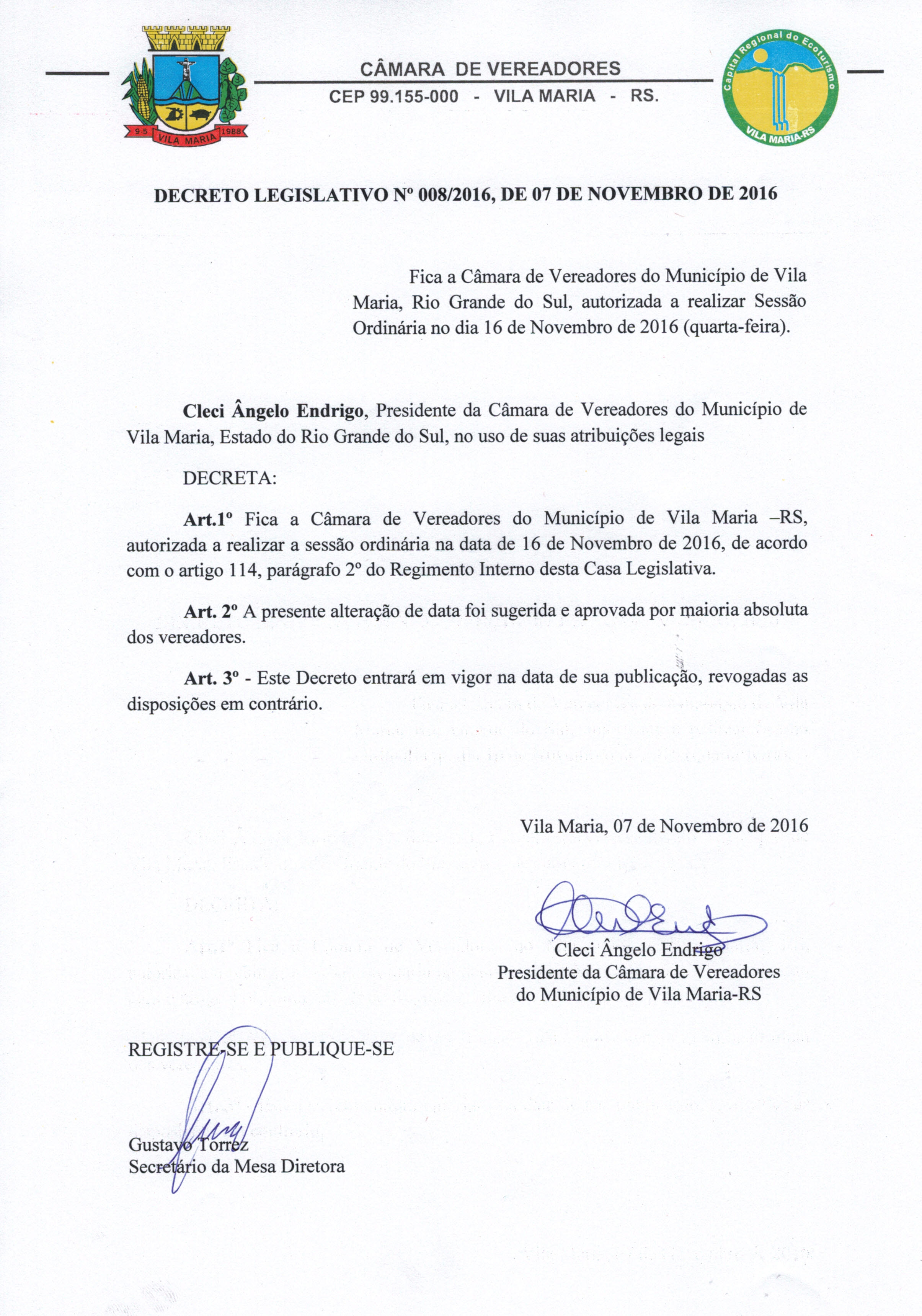 Fica a Câmara de Vereadores do Município de Vila Maria, Rio Grande do Sul, autorizada a realizar Sessão Ordinária no dia 16 de Novembro de 2016 (quarta-feira).
