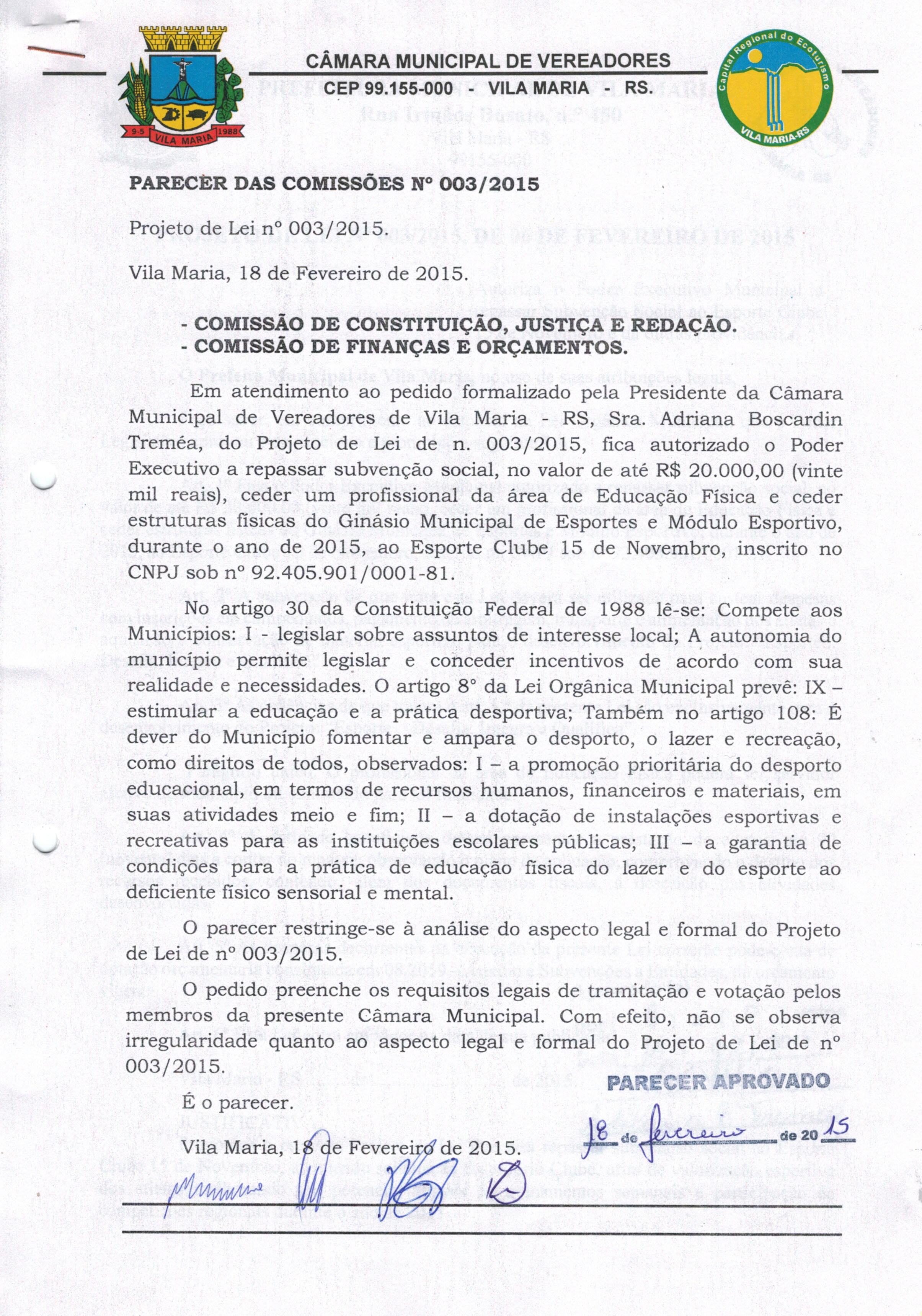 • Parecer 003/2015 e Projeto de Lei 003/2015 aprovados na Sessão do dia 18/02/2015 por 8 votos.