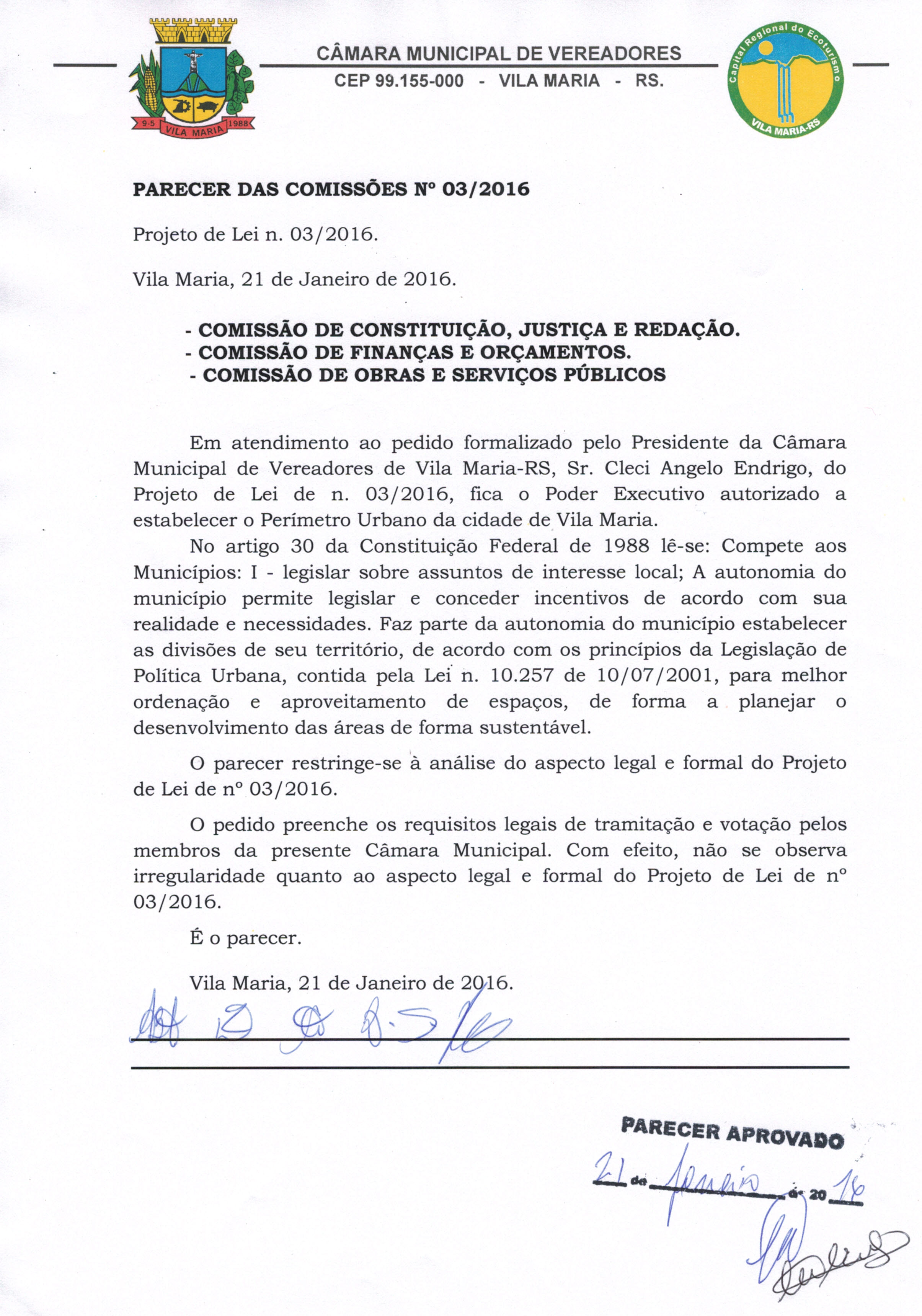 • Parecer 003/2016 e Projeto de Lei 003/2016 aprovado em 21/01/2016, na sessão Extraordinária por 07 votos.