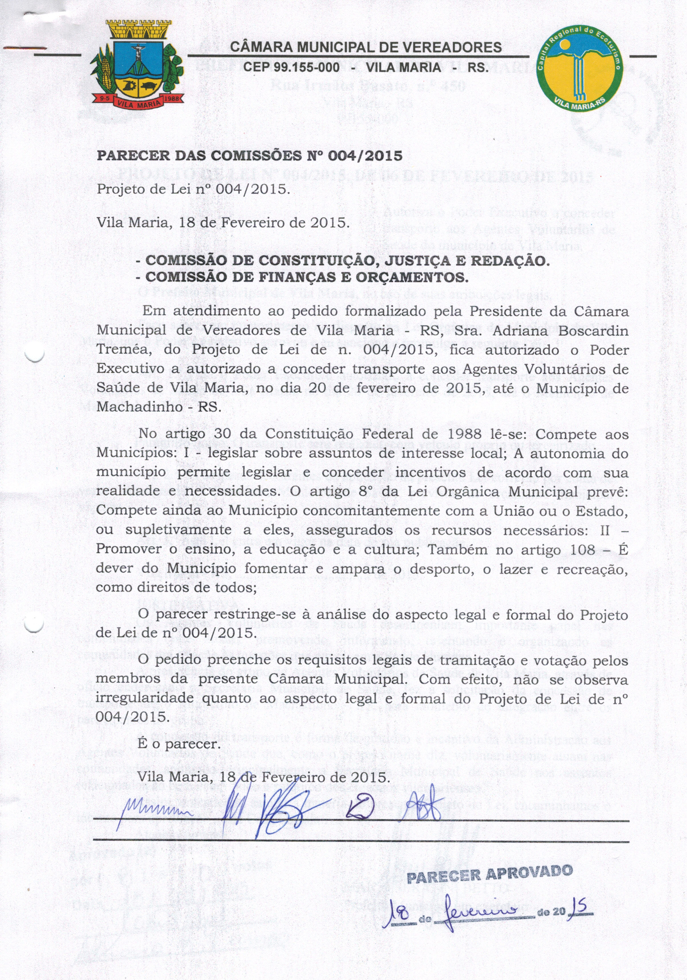 • Parecer 004/2015 e Projeto de Lei 004/2015 aprovados na Sessão de 18/02/2015, por 8 votos.