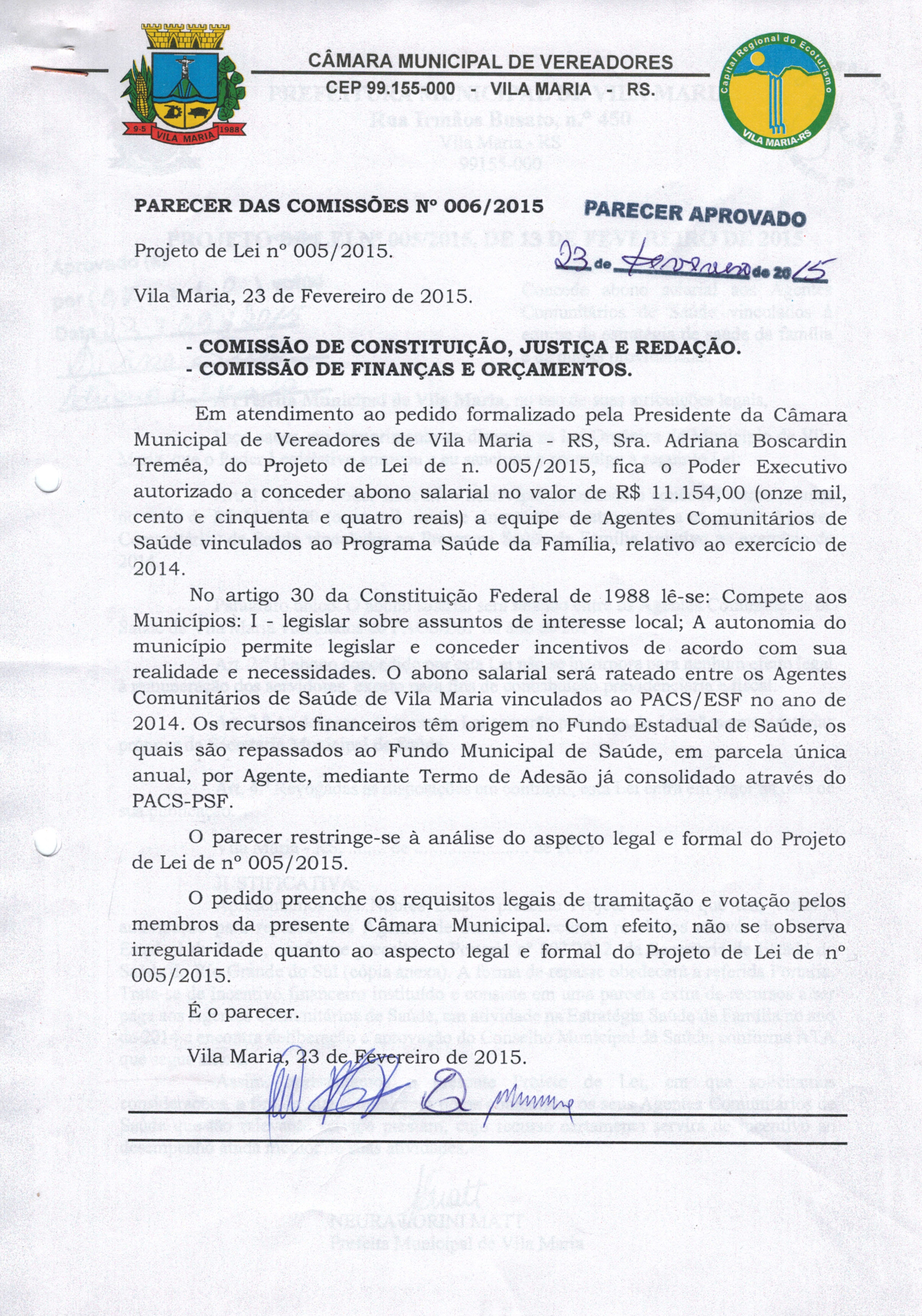 • Parecer 006/2015 e Projeto de Lei 005/2015, aprovados na Sessão do dia 23/02/2016 por 7 votos