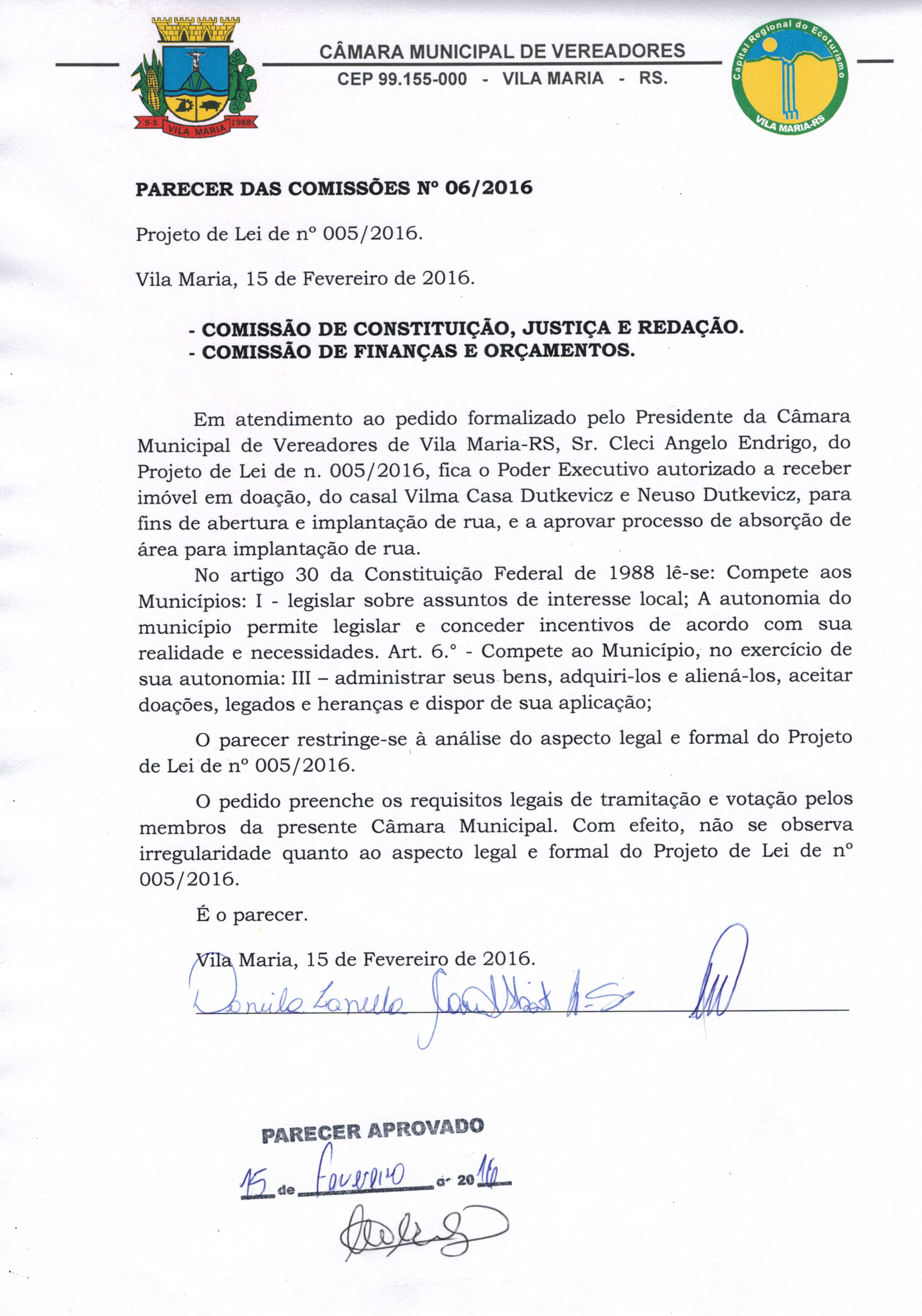 • Parecer 006-2016 e Projeto de Lei 005-2016 aprovados na sessão do dia 15/02/2016 por 7 votos.