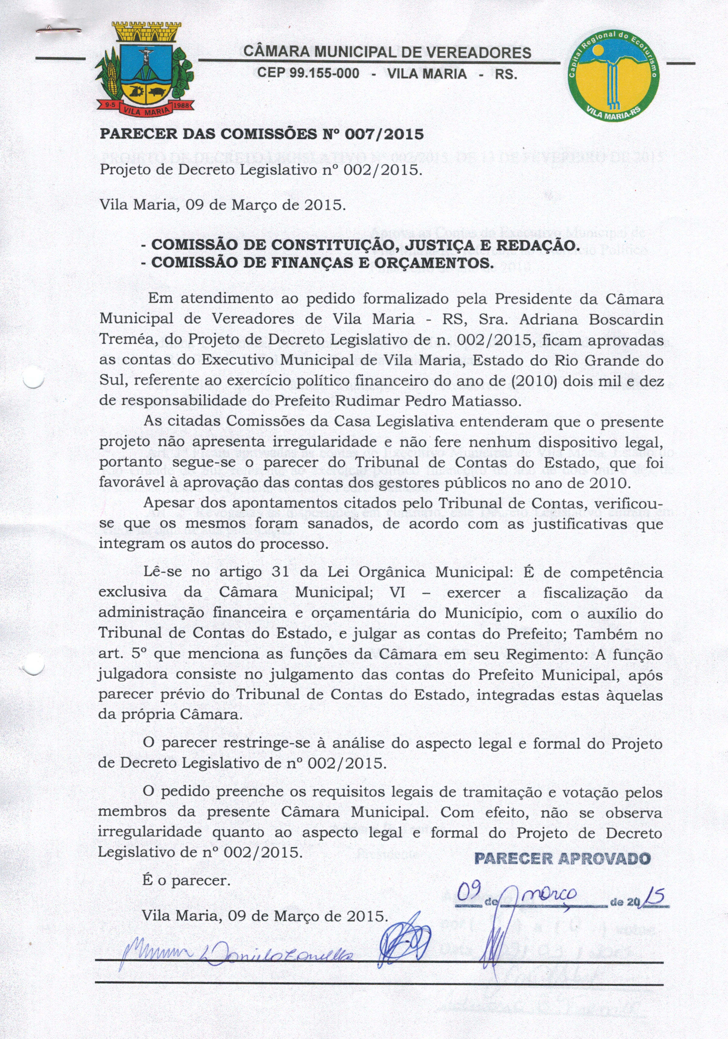 • Parecer 007/2015 e Projeto de Decreto Legislativo 002/2015 aprovados por 7 votos e 1 Abstenção na Sessão de 09/03/2015