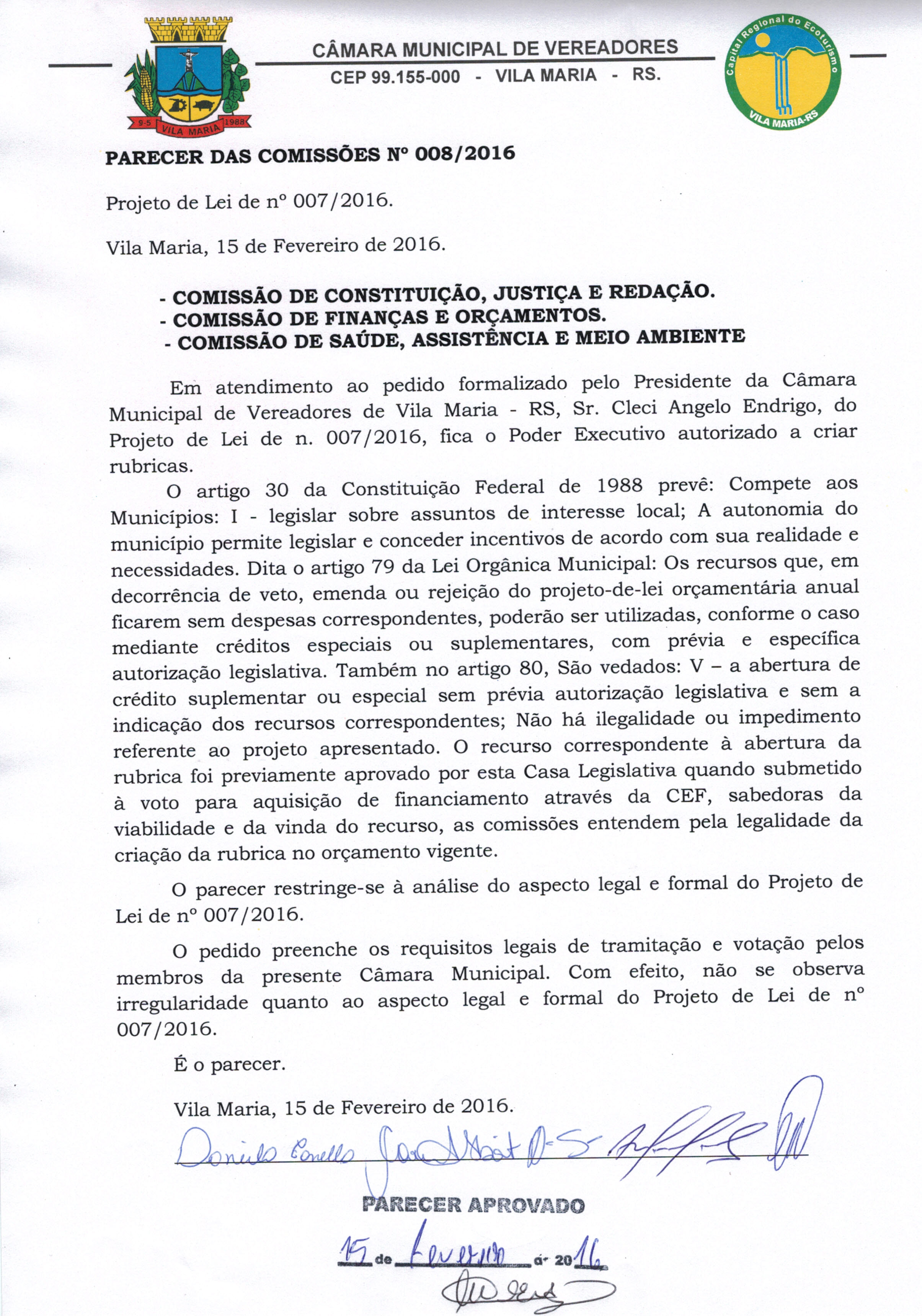 • Parecer 008/2016 e Projeto de Lei 007/2016 aprovados na sessão do dia 15/02/2016, por 7 votos.