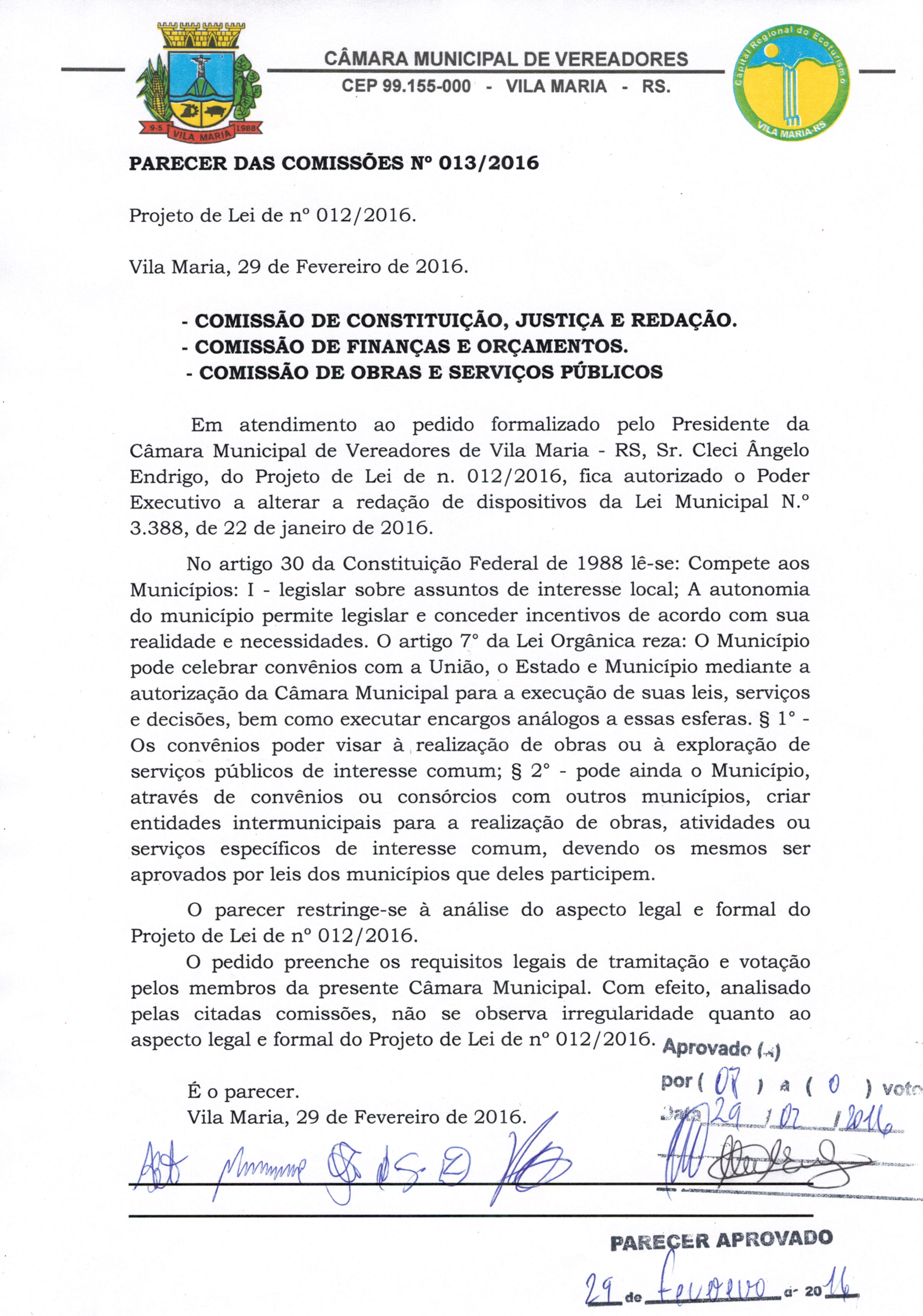 • Parecer 013/2016 e Projeto de Lei 012/2016 aprovados na sessão Ordinária do dia 29/02/2016, por todos os vereadores.