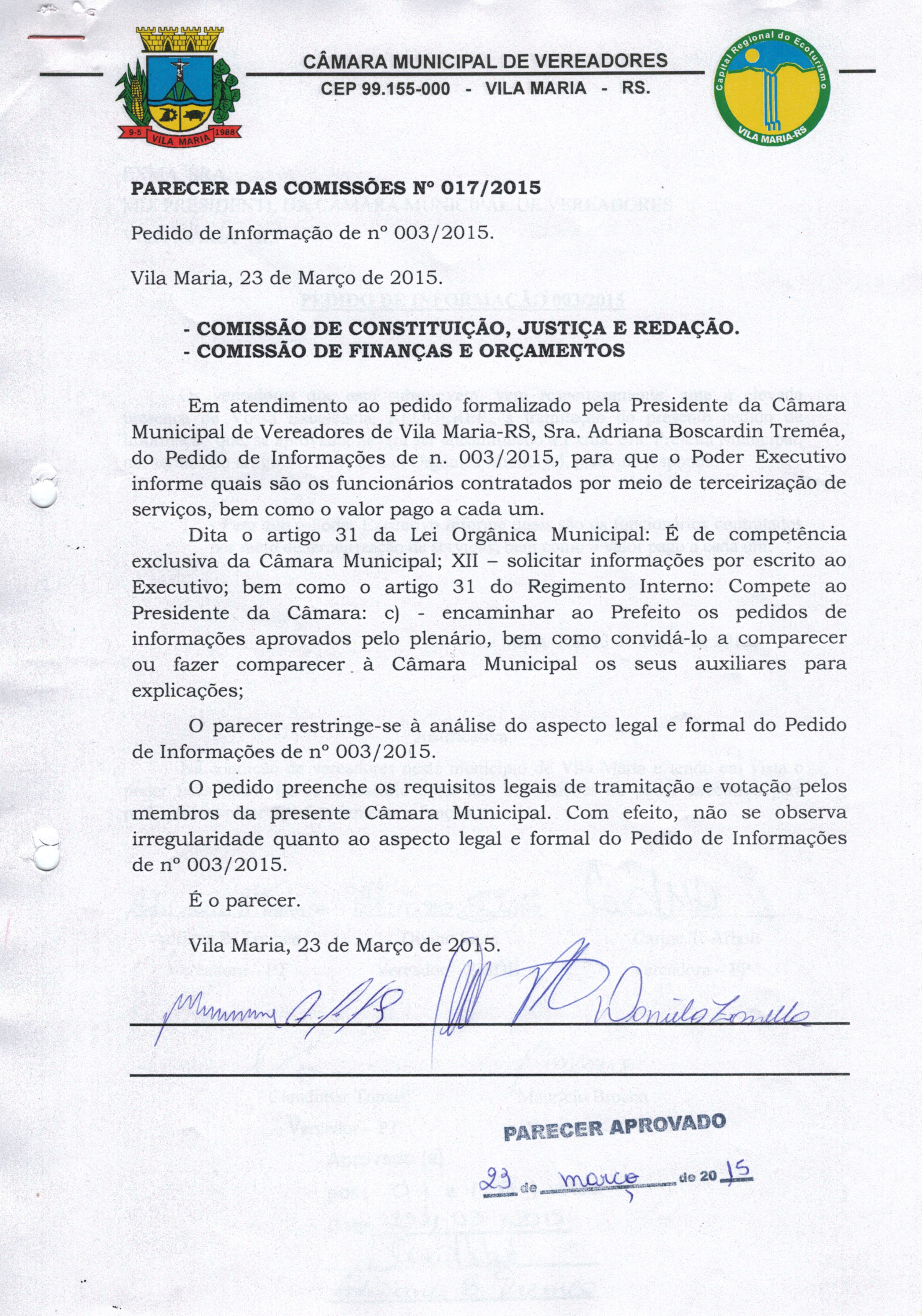 • Parecer 017/2015 e Pedido de Informação 003/2015 aprovados por 8 votos em 23/03/2015.