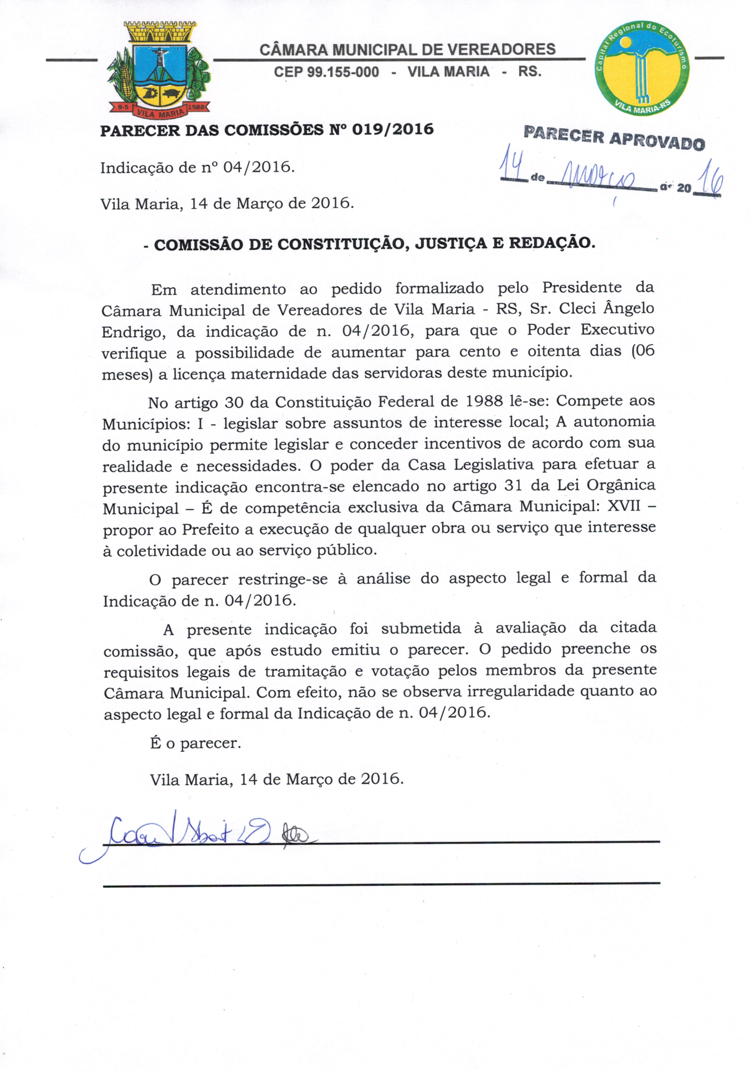 • Parecer 019/2016 e Indicação 04/2016 aprovadas na sessão do dia 14/03/2016 por todos os vereadores.