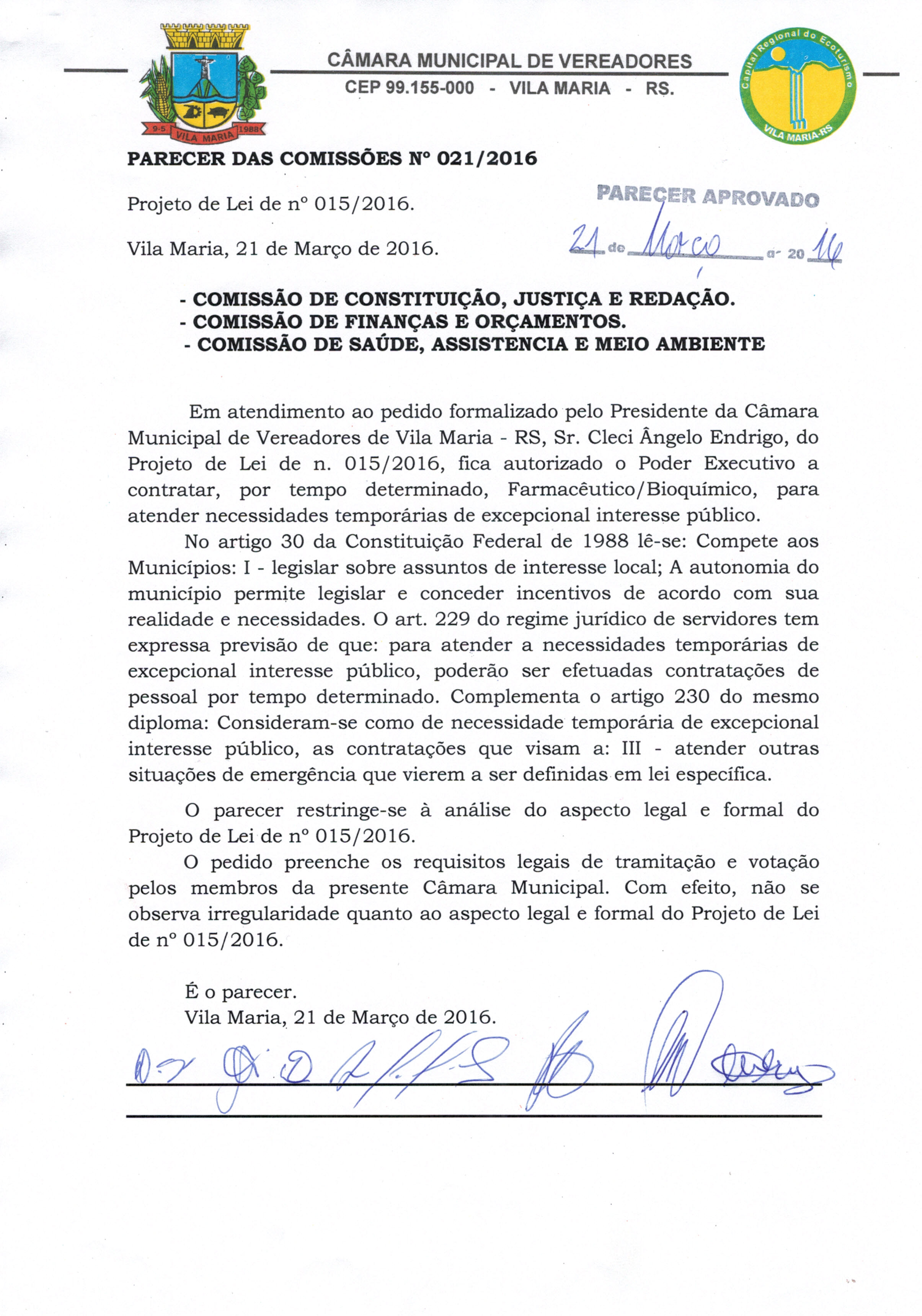 • Parecer 021/2016 e Projeto de Lei 015/2016 aprovados na sessão do dia 21/03/2016.