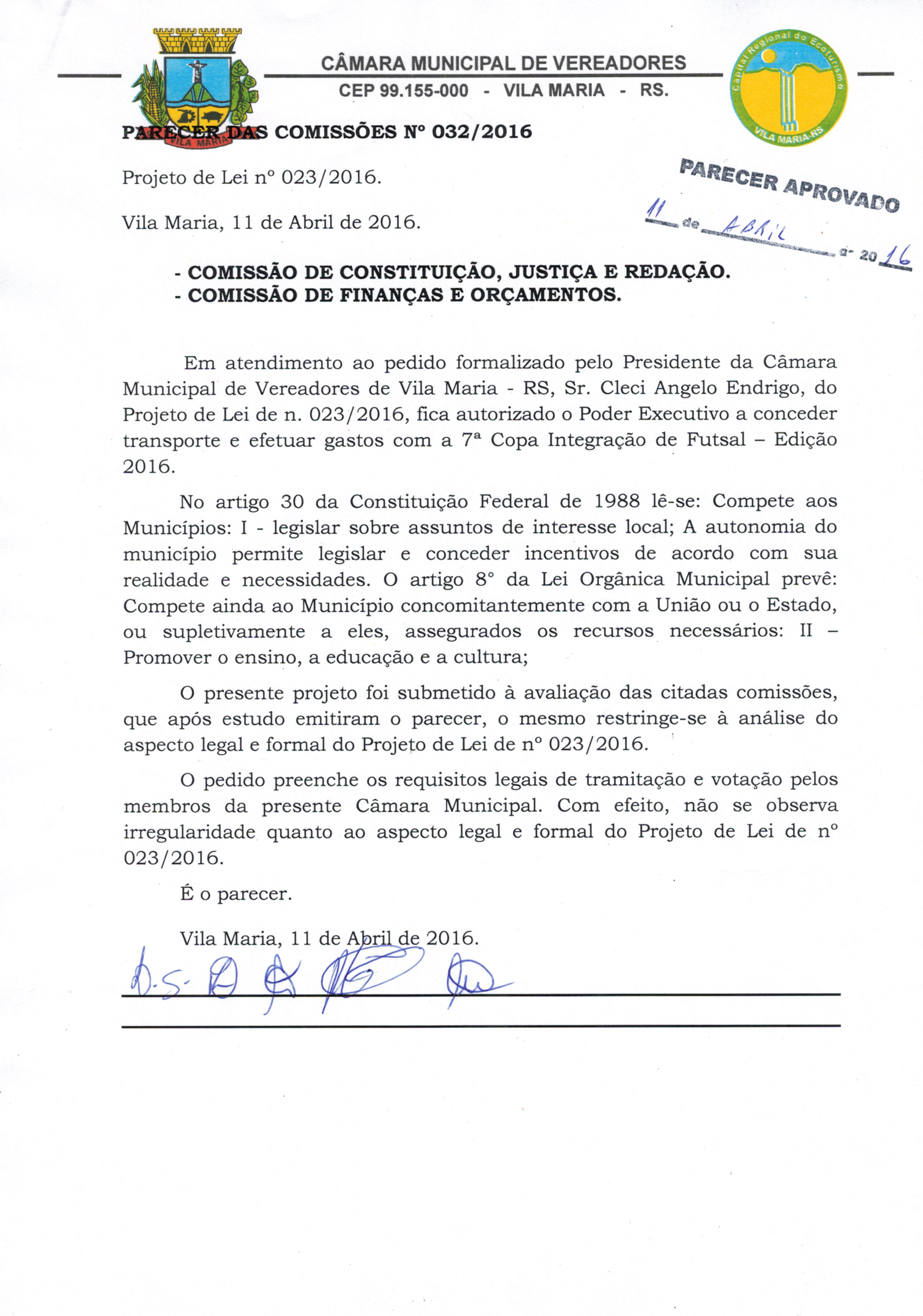 • Parecer 032/2016 e Projeto de Lei 023/2016 aprovados na sessão do dia 11/04/2016 por 07 votos.