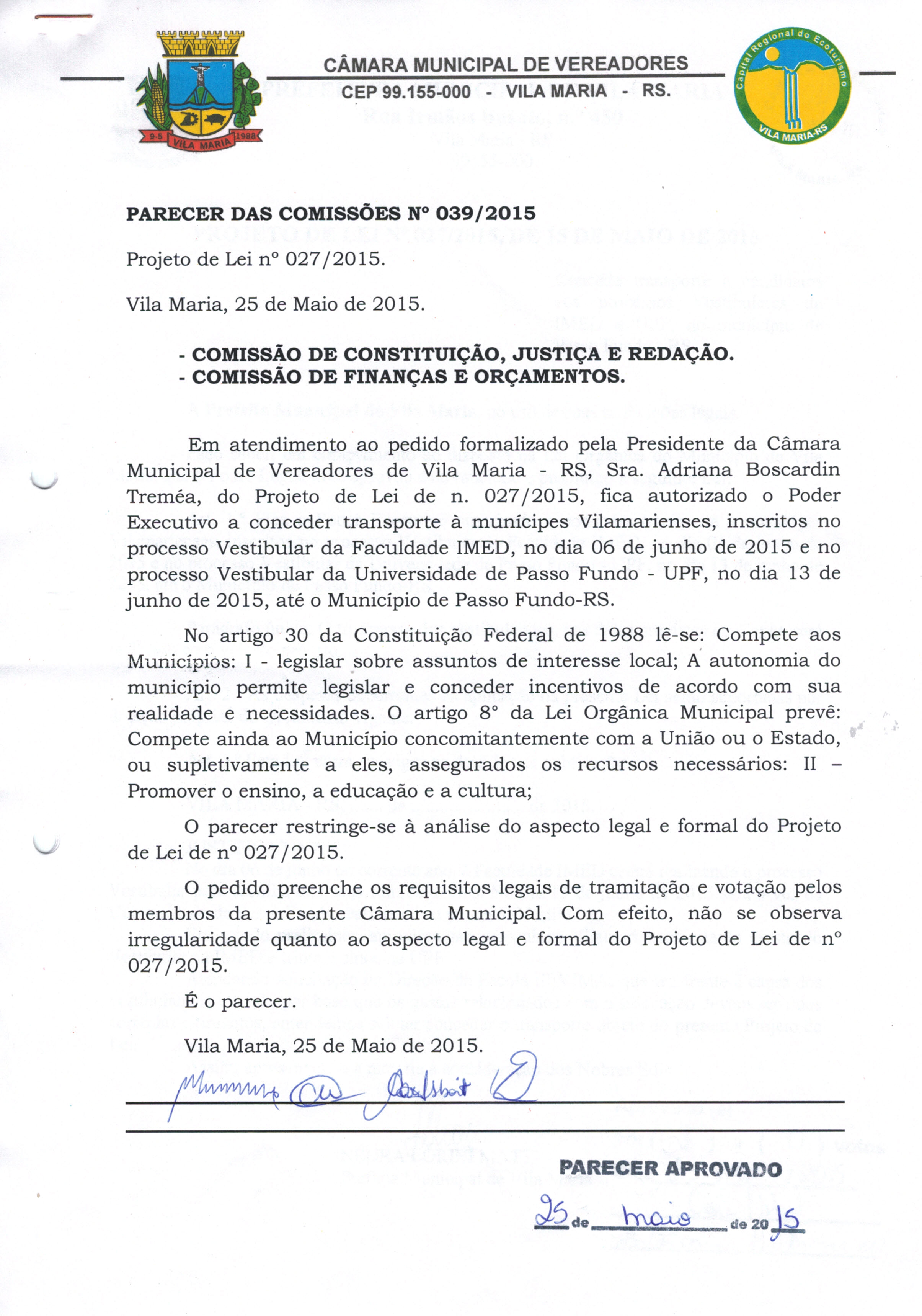 • Parecer 039/2015 e Projeto de Lei 027/2015 aprovados na sessão do dia 25/05/2015 por 5 votos.
