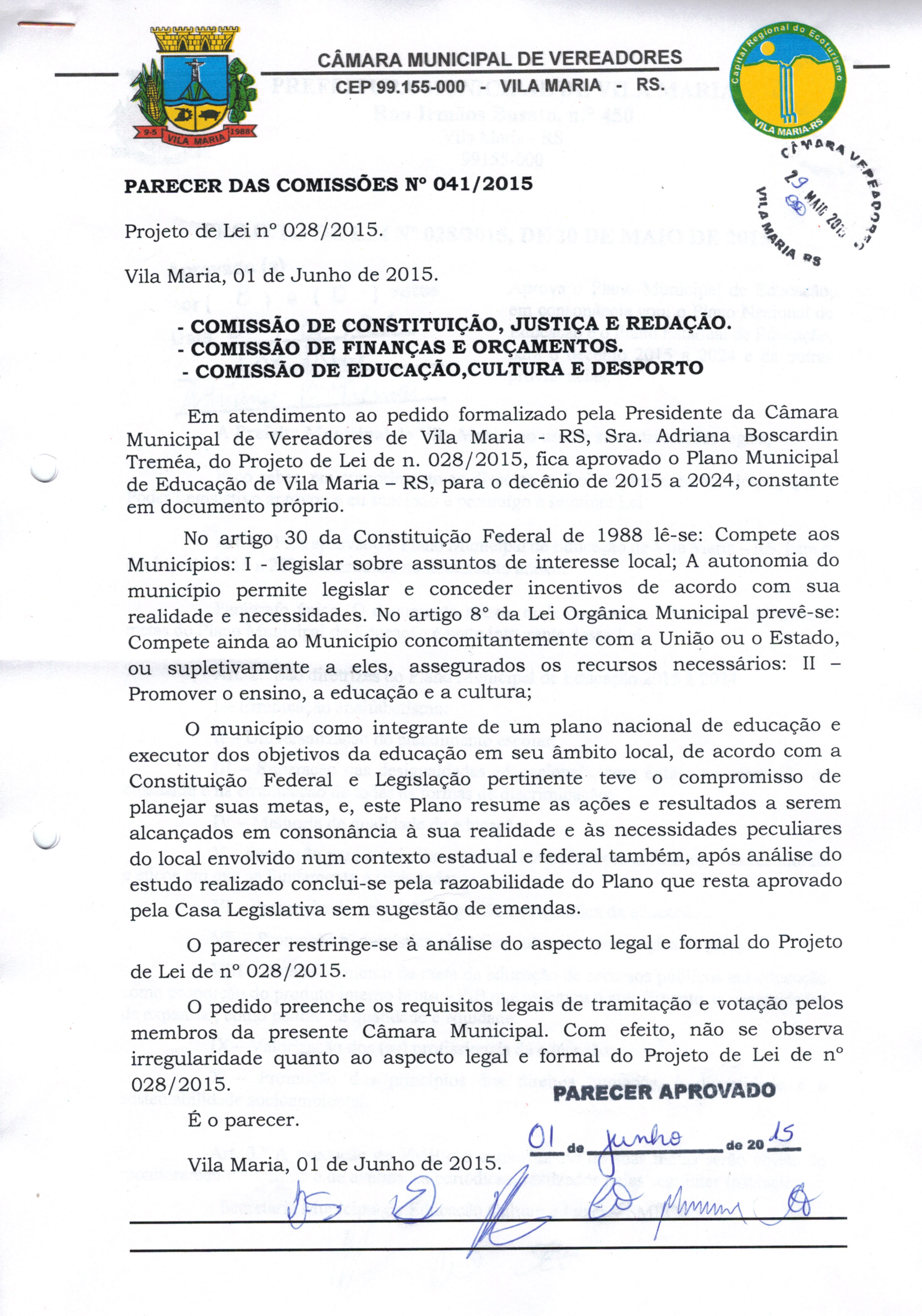 • Parecer 041/2015 e Projeto de Lei 028/2015 aprovados na sessão de 01/06/2015 por 8 votos.