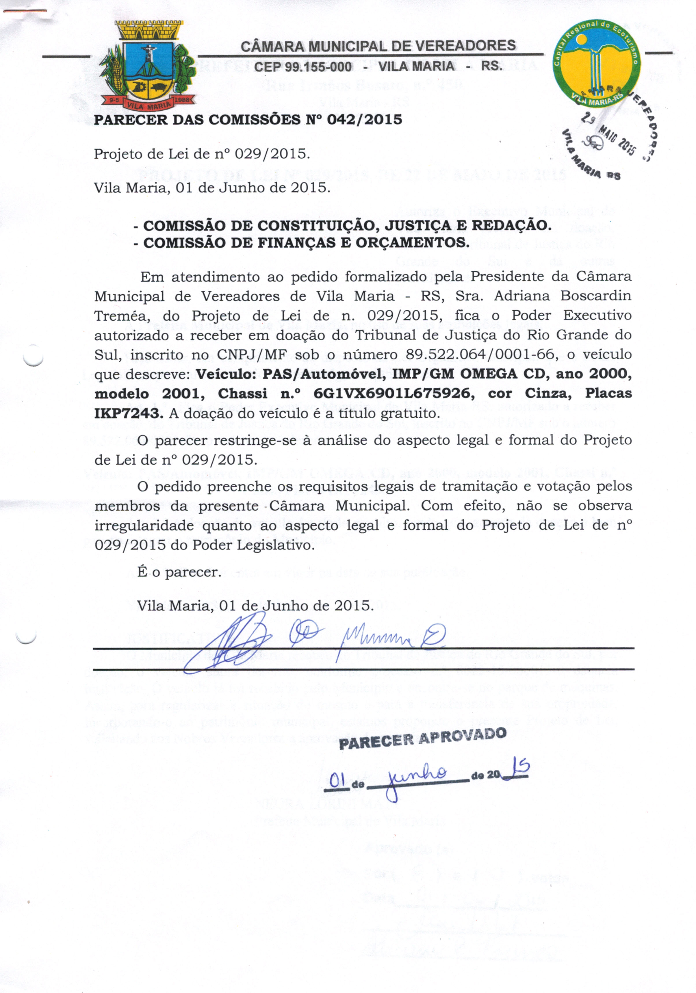 • Parecer 042/2015 e Projeto de Lei 029/2015 aprovados na sessão de 01/06/2015 por 8 votos