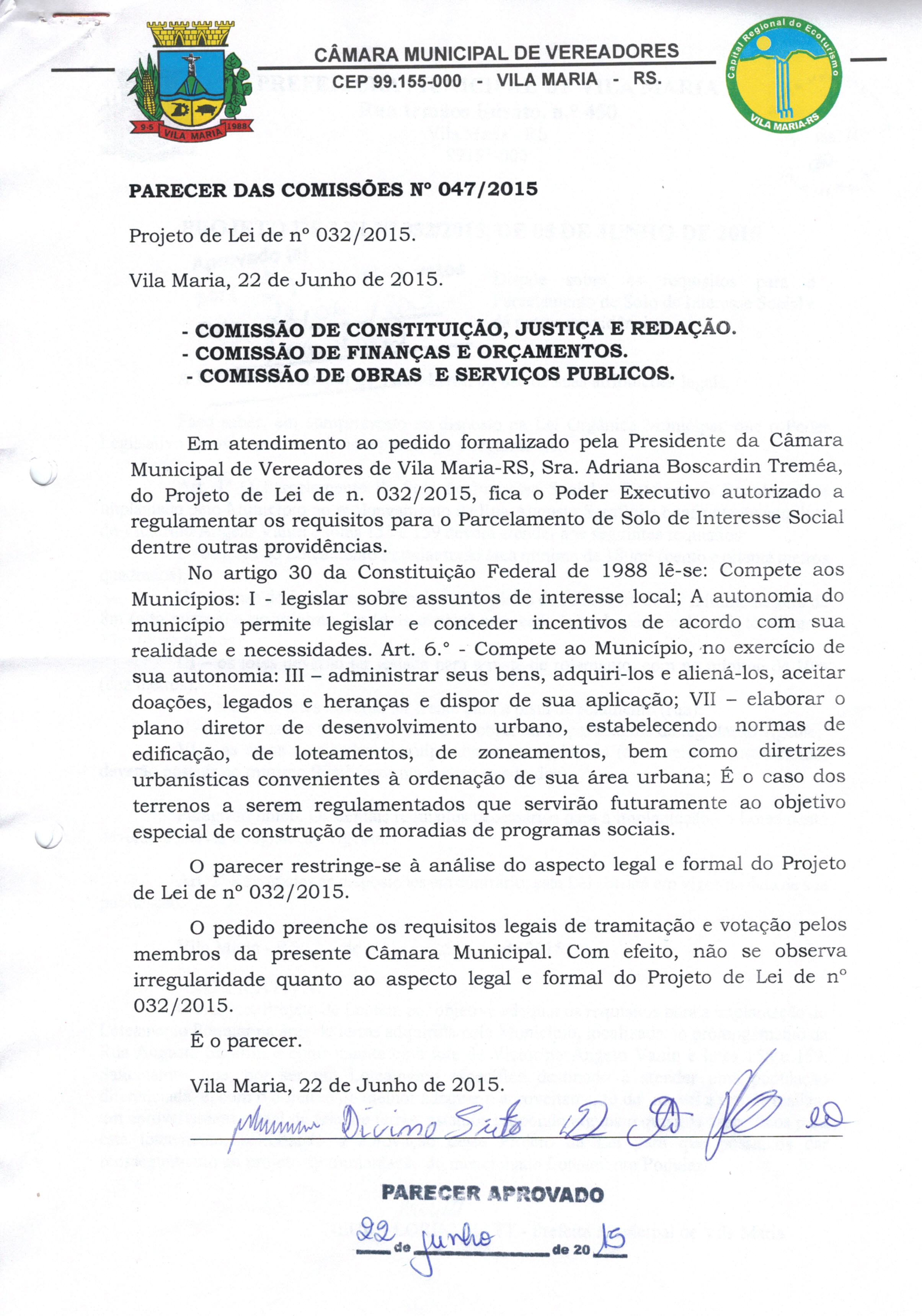 • Parecer 047/2015 e Projeto de Lei 032/2015 aprovados na sessão do dia 22/06/2015 por 8 votos.