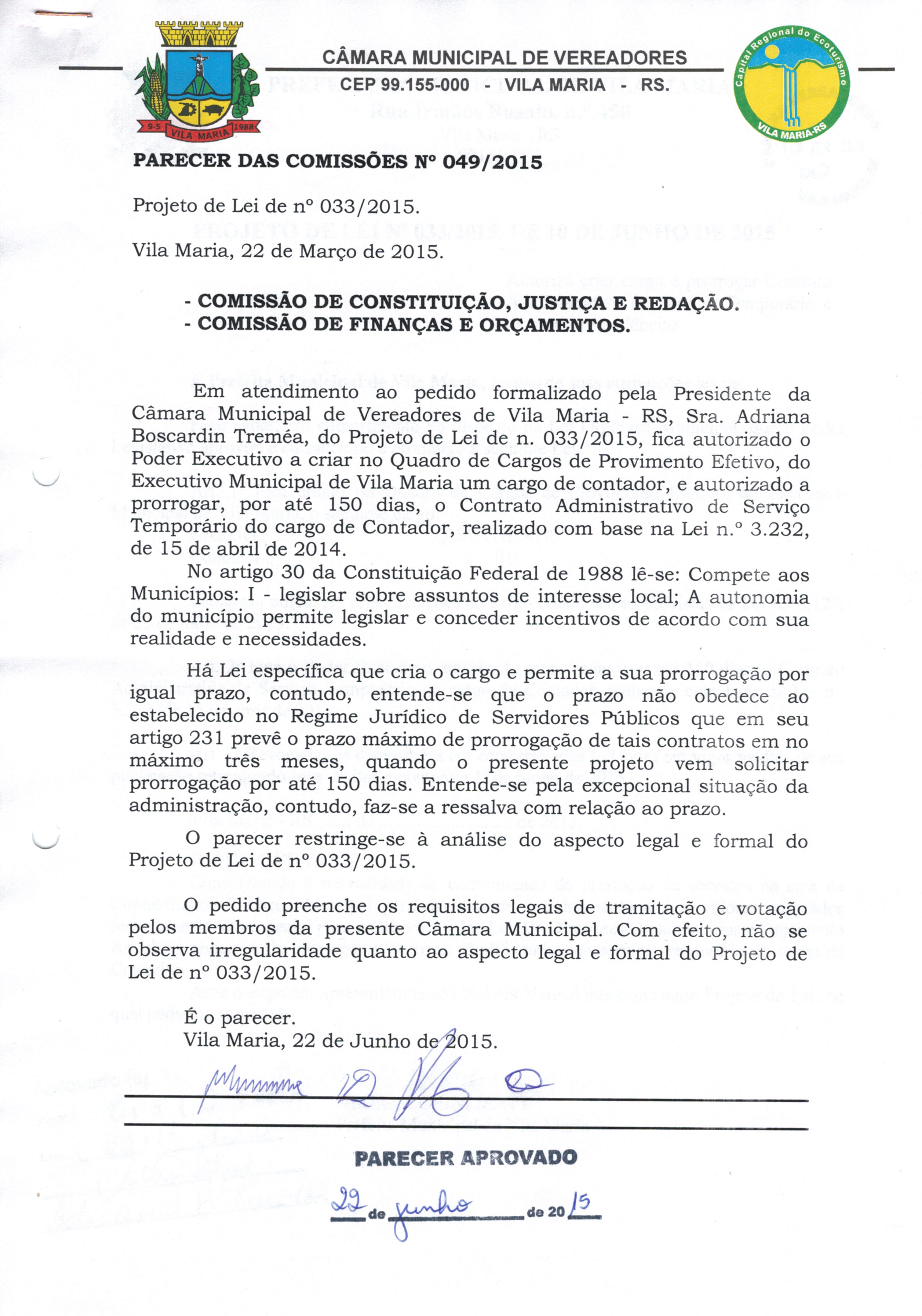 • Parecer 049/2015 e Projeto de Lei 033/2015 aprovados na sessão de 22/06/2015 por 8 votos.