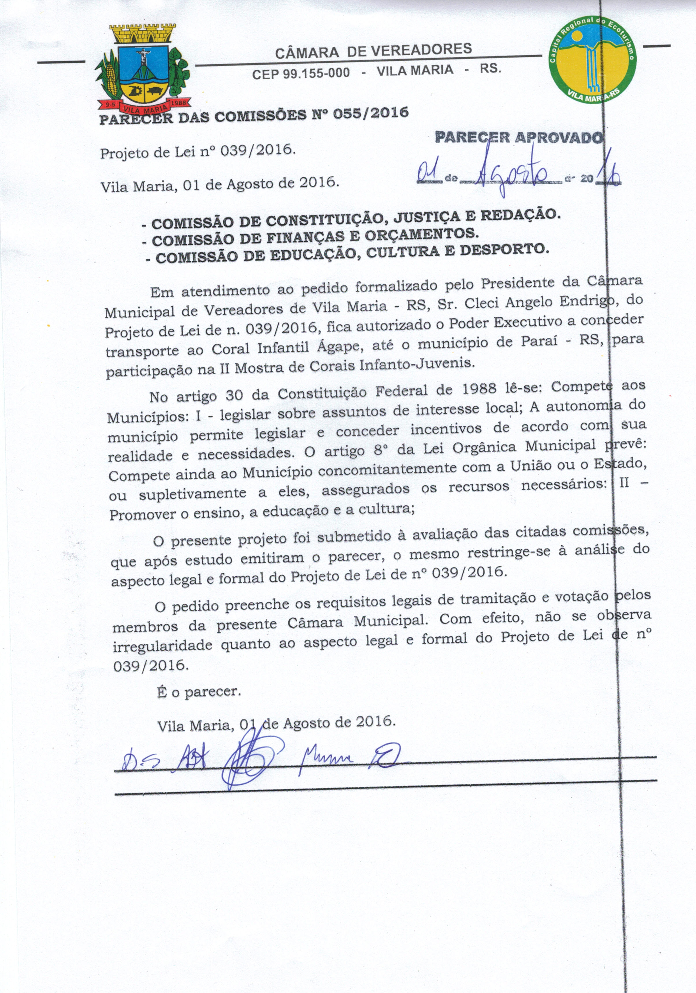 • Parecer 055/2016 e Projeto de Lei 039/2016 aprovados na sessão do dia 01/08/2016.
