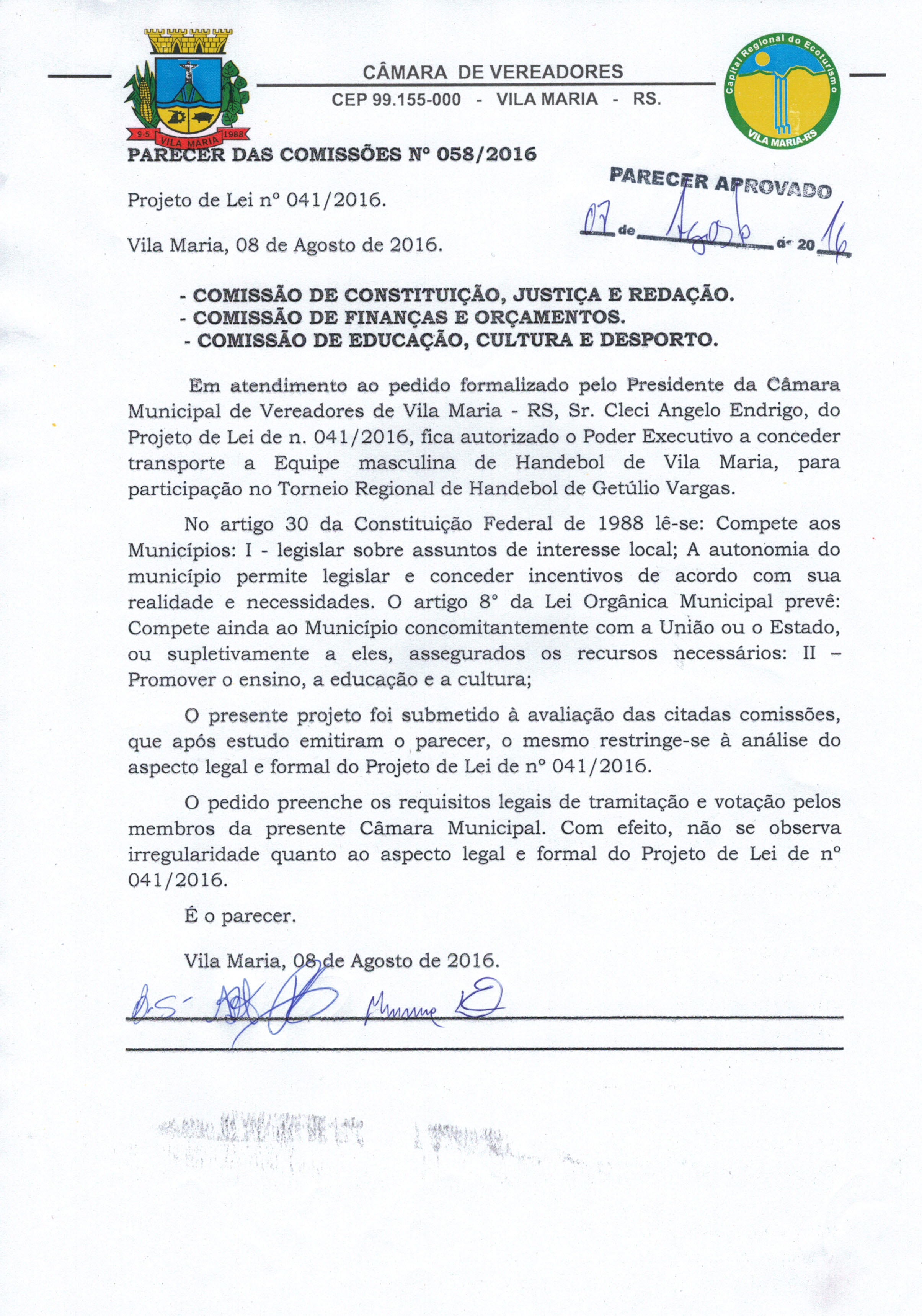 • Parecer 058/2016 e Projeto de Lei 041/2016 aprovados na sessão do dia 08/08/2016.