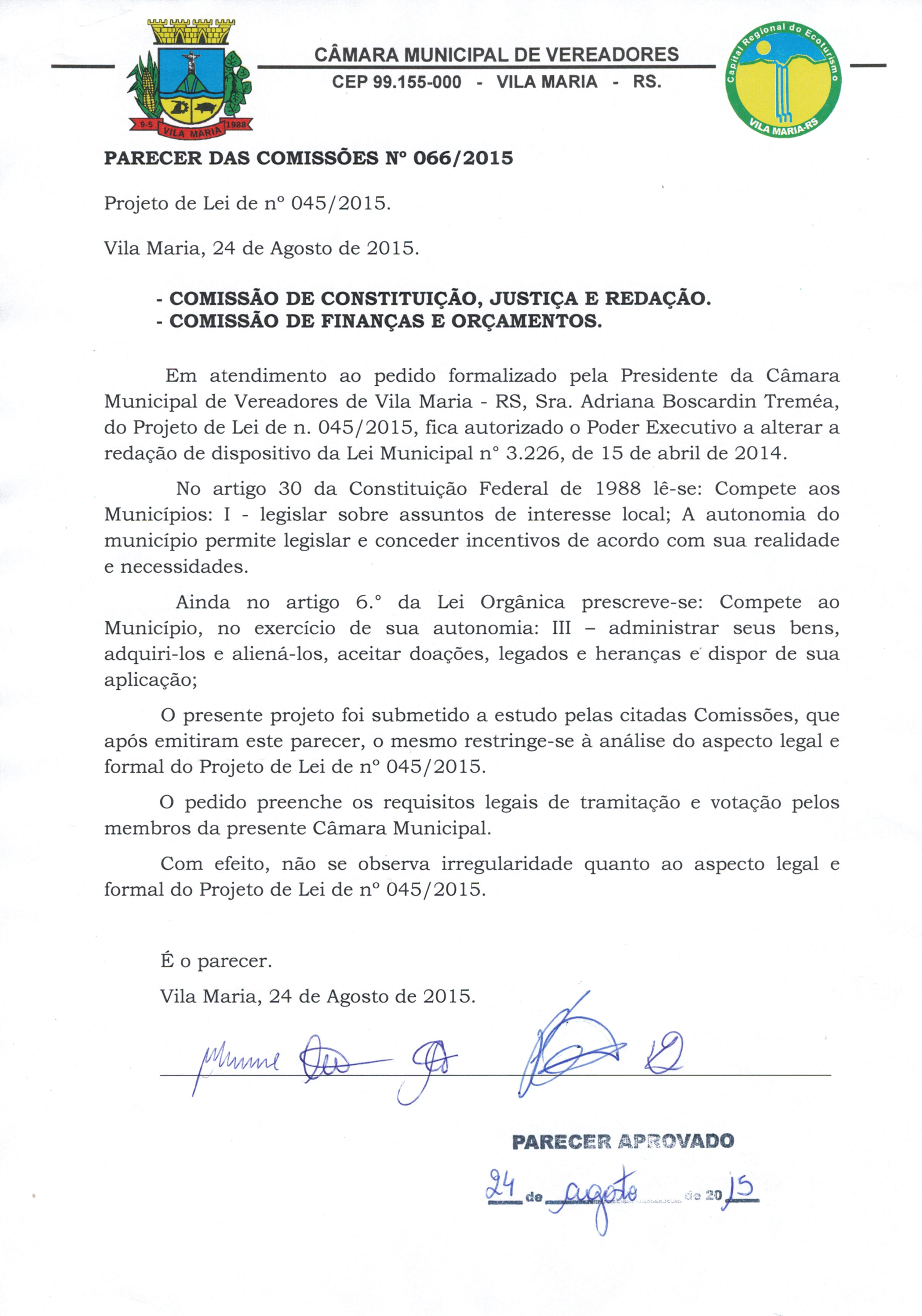 • Parecer 066/2015 e Projeto de Lei 045/2015 aprovados na sessão de 24/08/2015 por 8 votos.