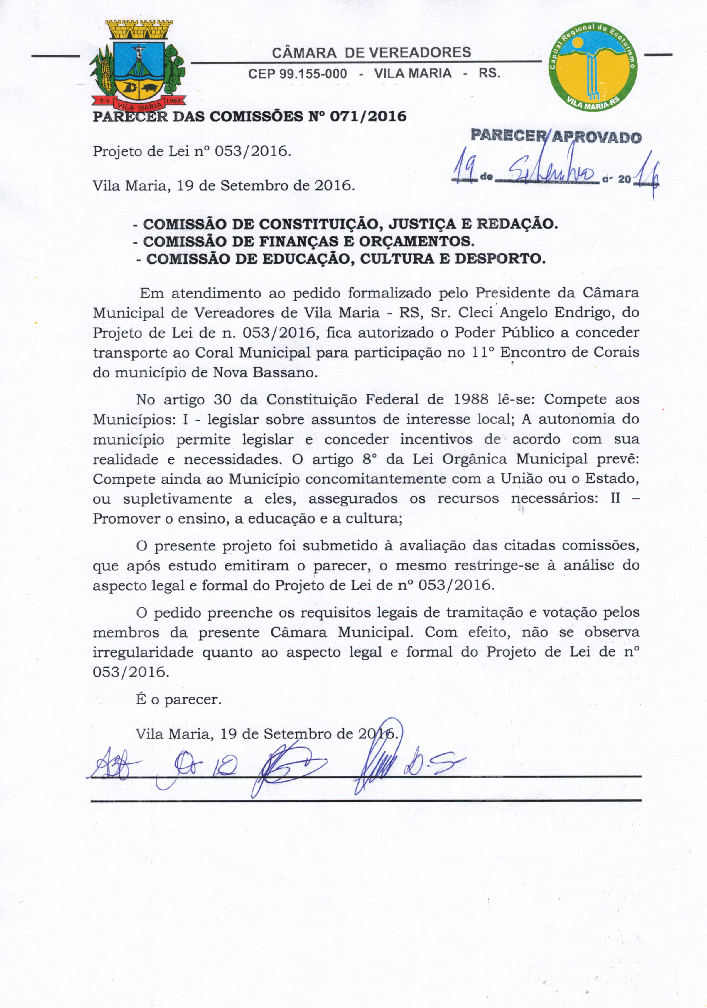 Parecer 071/2016, Projeto de Lei 053/2016