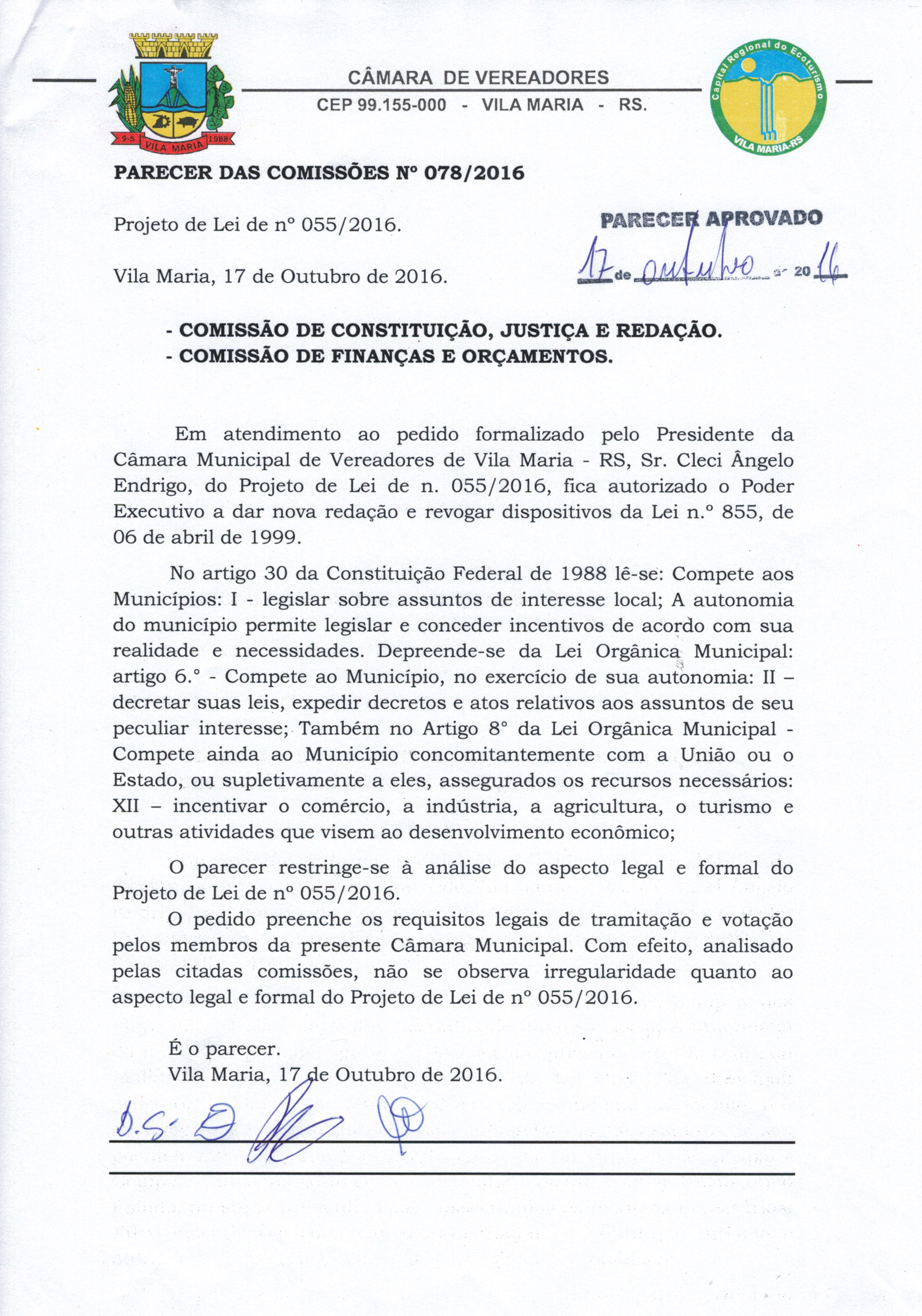 • Parecer 078/2016 e Projeto de Lei 055/2016 com Emenda ao Parágrafo Ùnico do Artigo 6º da Lei 855 de 06 de Abril de 1999, aprovados pelos vereadores.