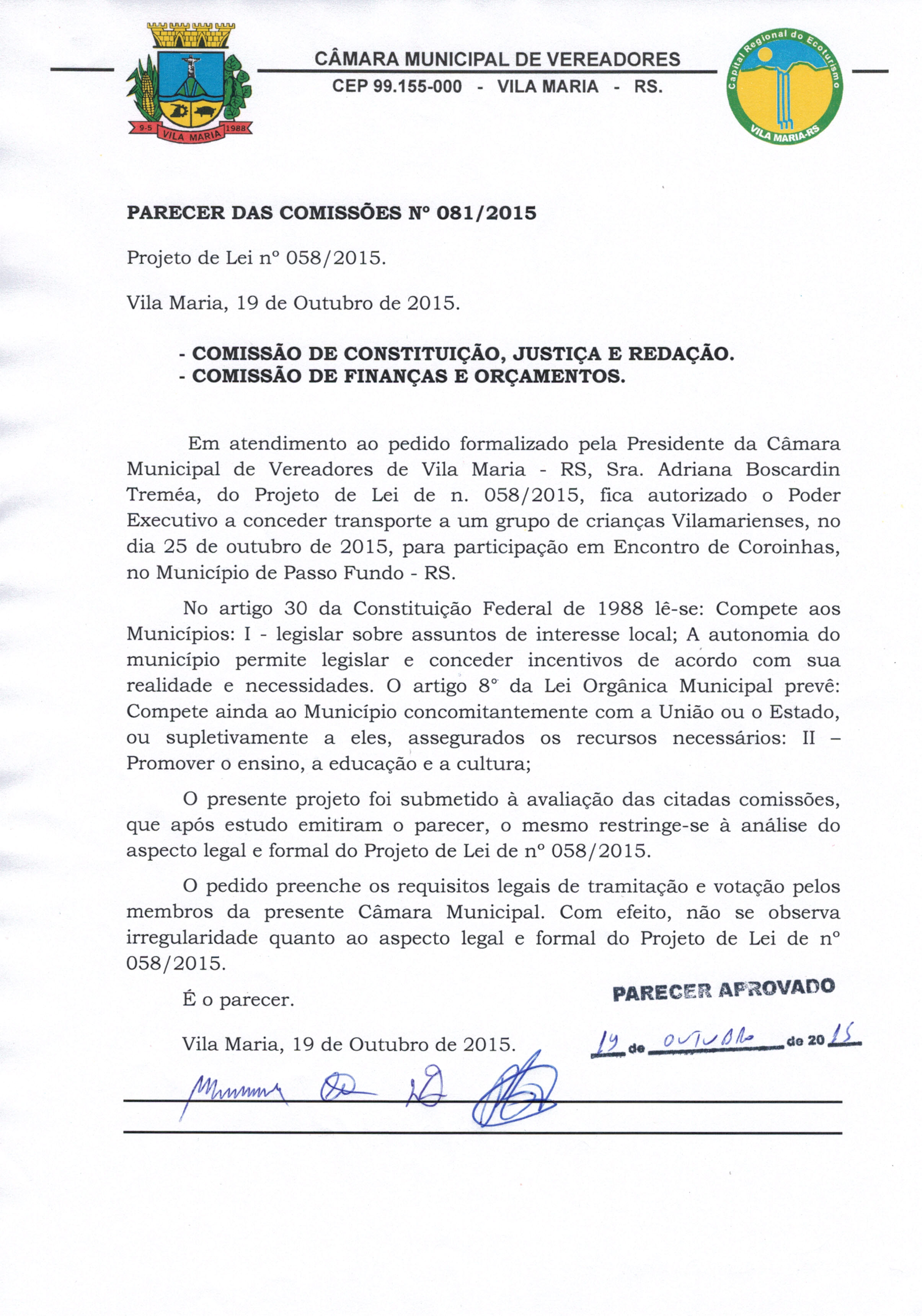 Parecer 081/2015 do Projeto de Lei 058/2015
