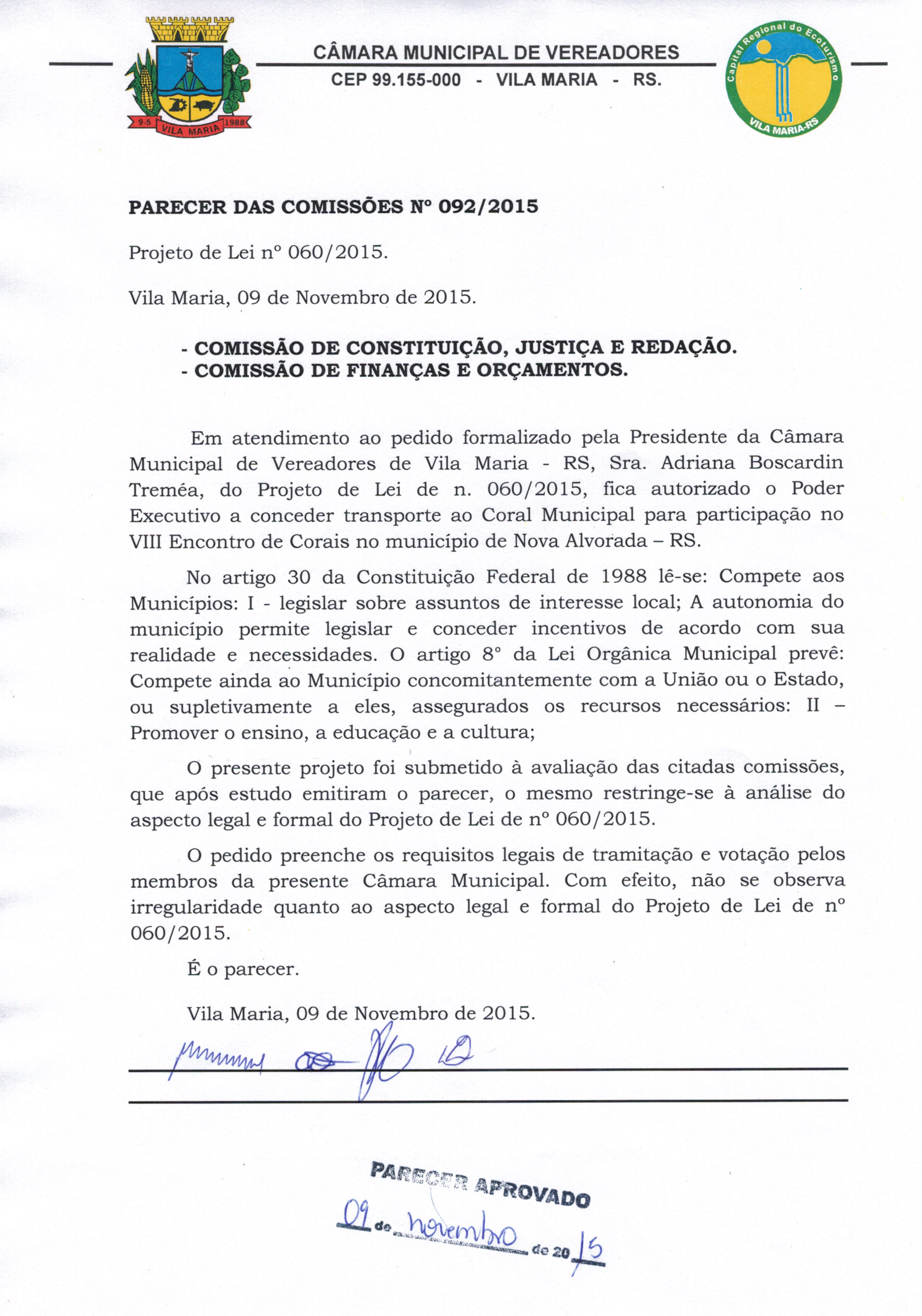 • Parecer 092/2015 e Projeto de Lei 060/2015 aprovados na sessão de 09/11/2015 por 8 votos