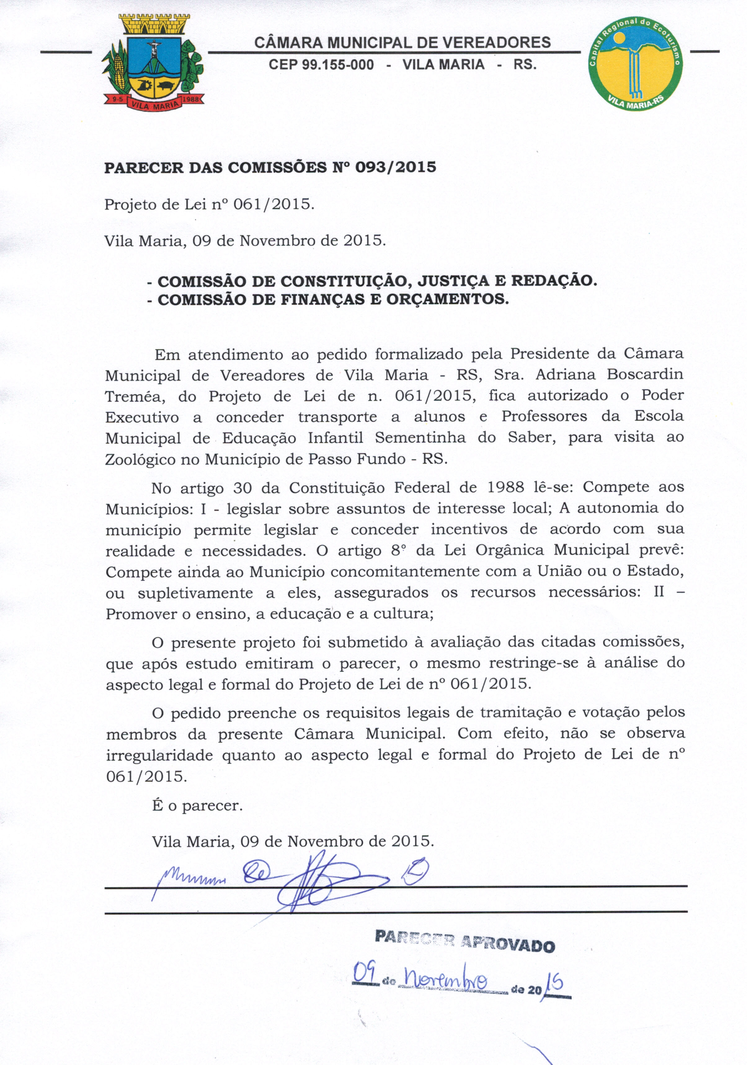 • Parecer 093/2015 e Projeto de Lei 061/2015 aprovados na sessão de 09/11/2015 por 8 votos.