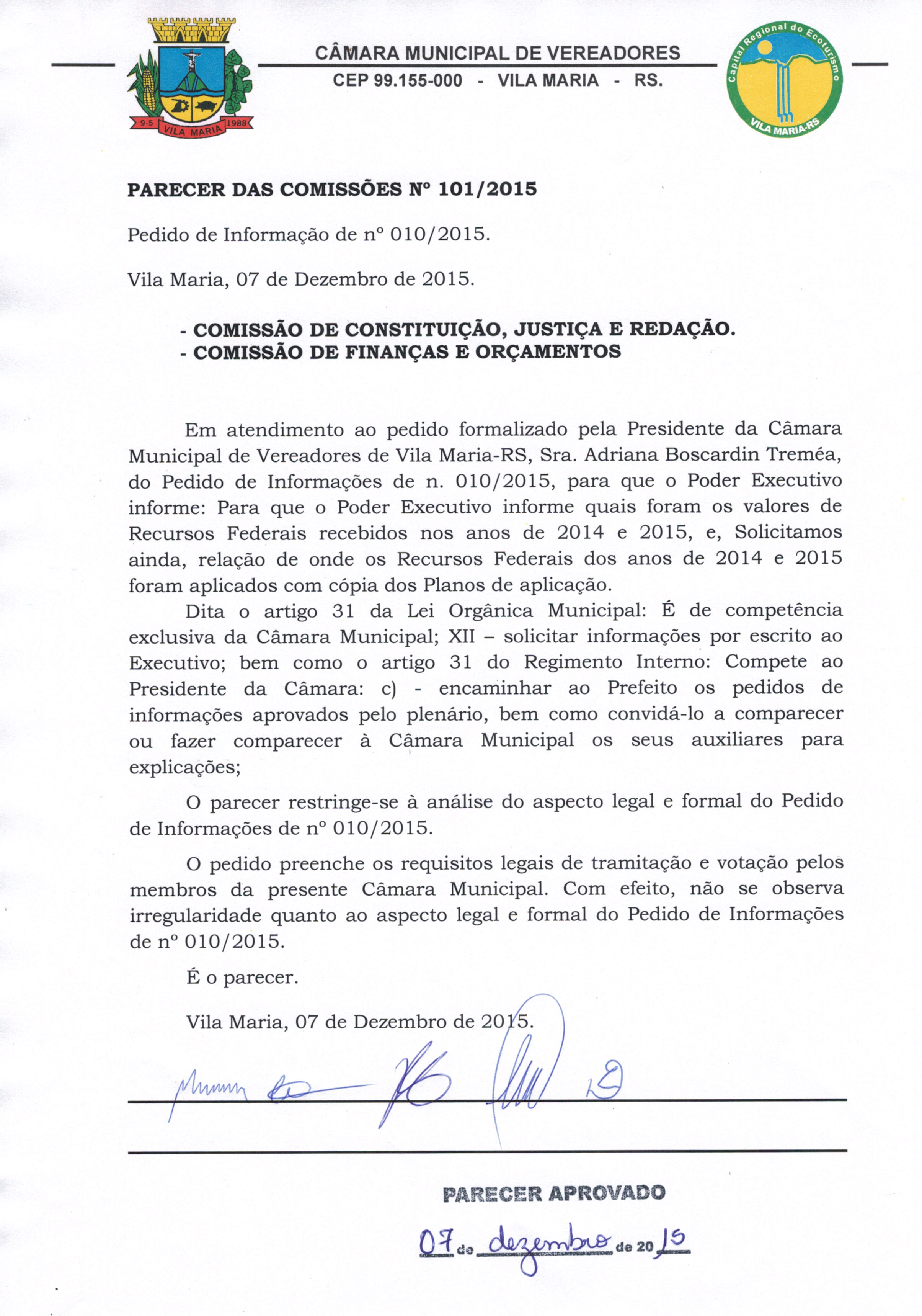 • Parecer 101/2015 e Pedido de Informação 010/2015 aprovados na sessão de 07/12/2015 por unanimidade