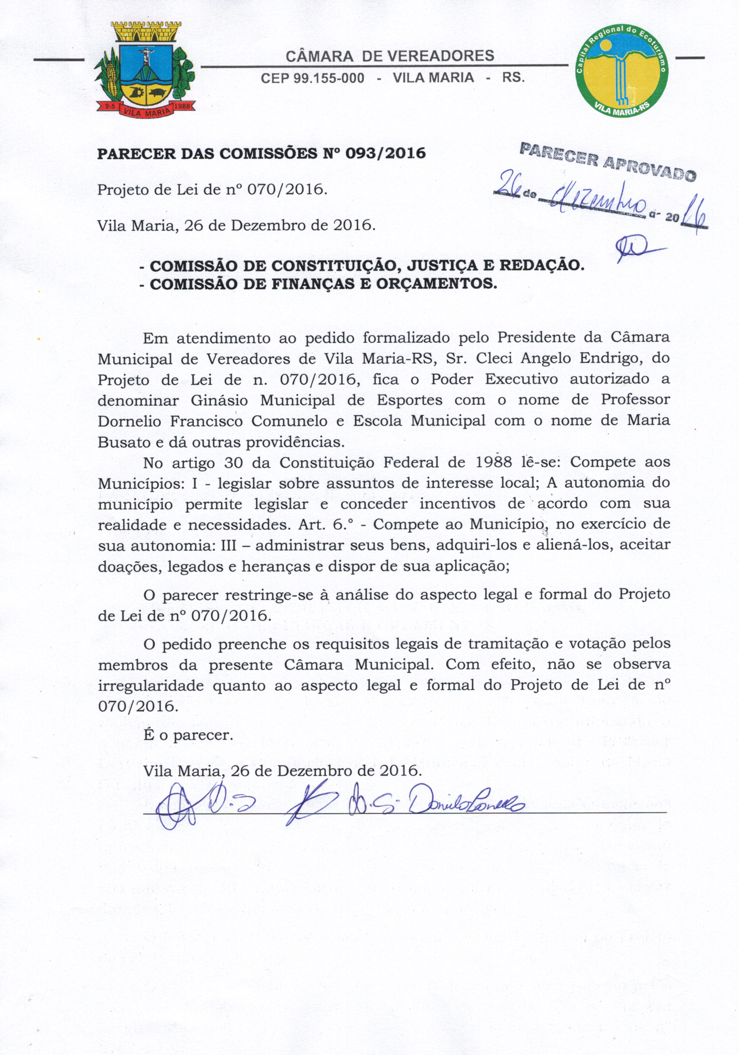 Parecer 93/2016, Projeto de Lei 070/2016