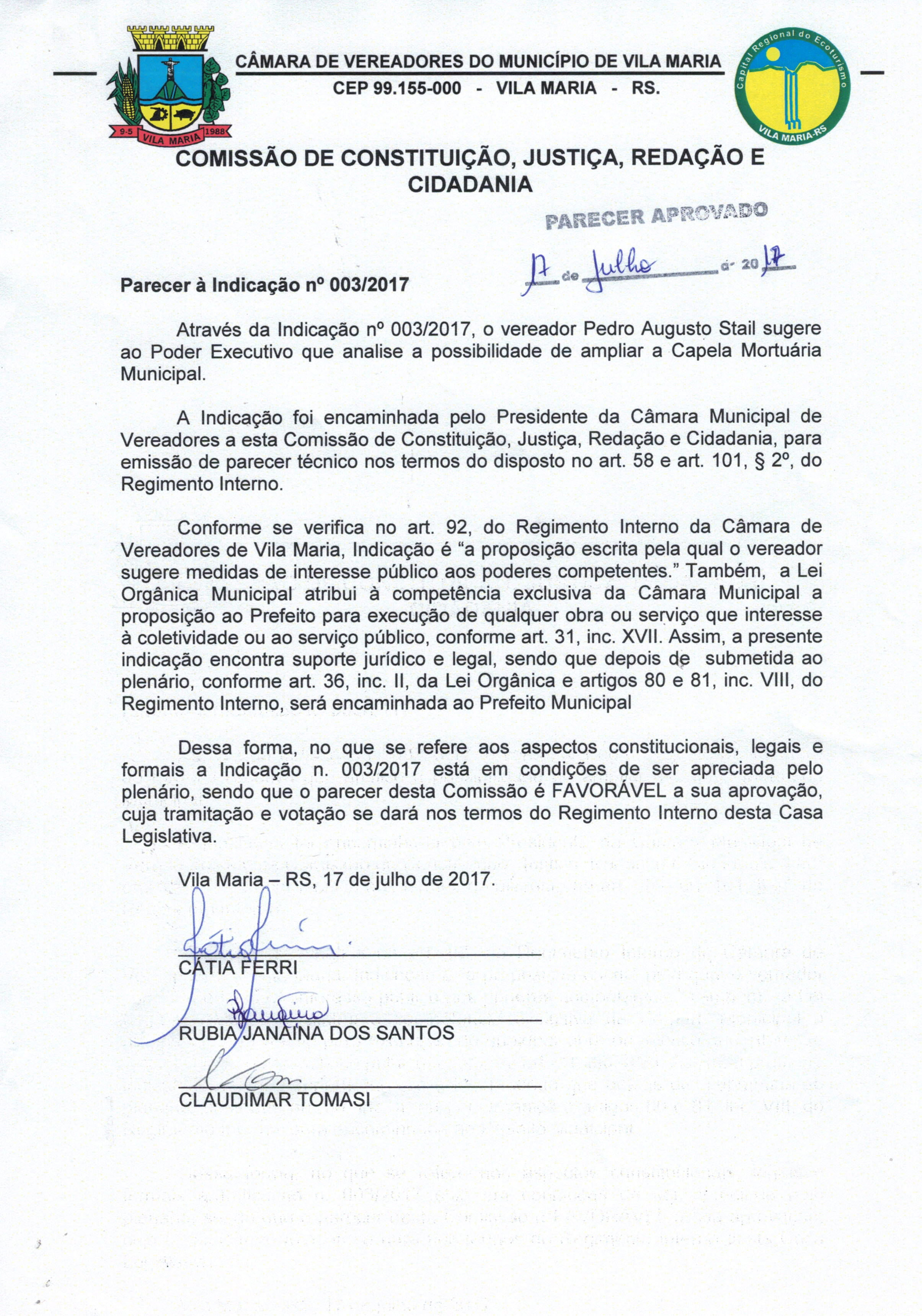 • Parecer e Indicação 003/2017 aprovadas por todos os vereadores.