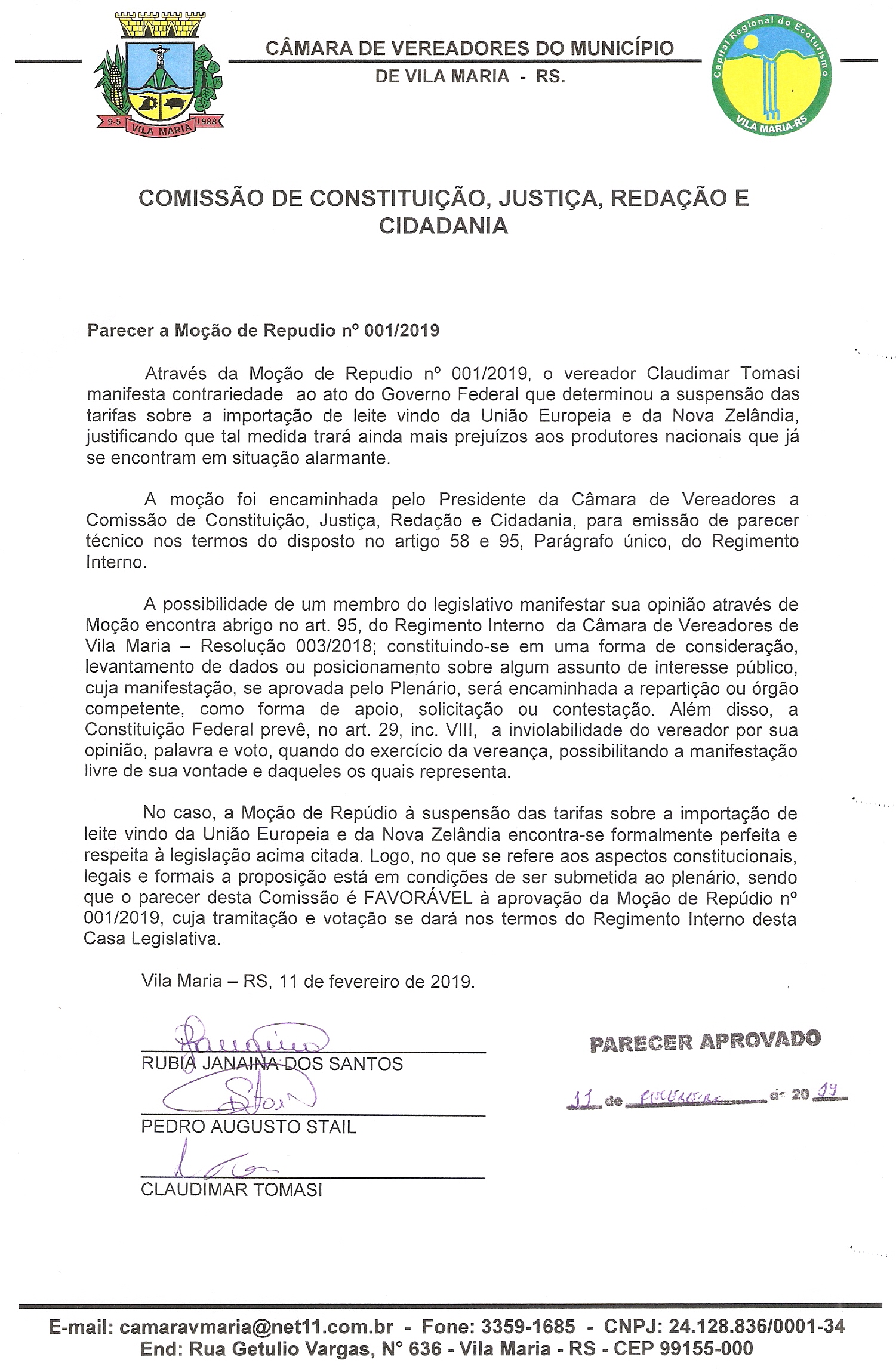 O parecer e a Moção 001/2019 de repúdio a decisão de suspender as tarifas sobre a importação de leite vindo da União Européia e da Nova Zelândia foram aprovadas por todos os vereadores.