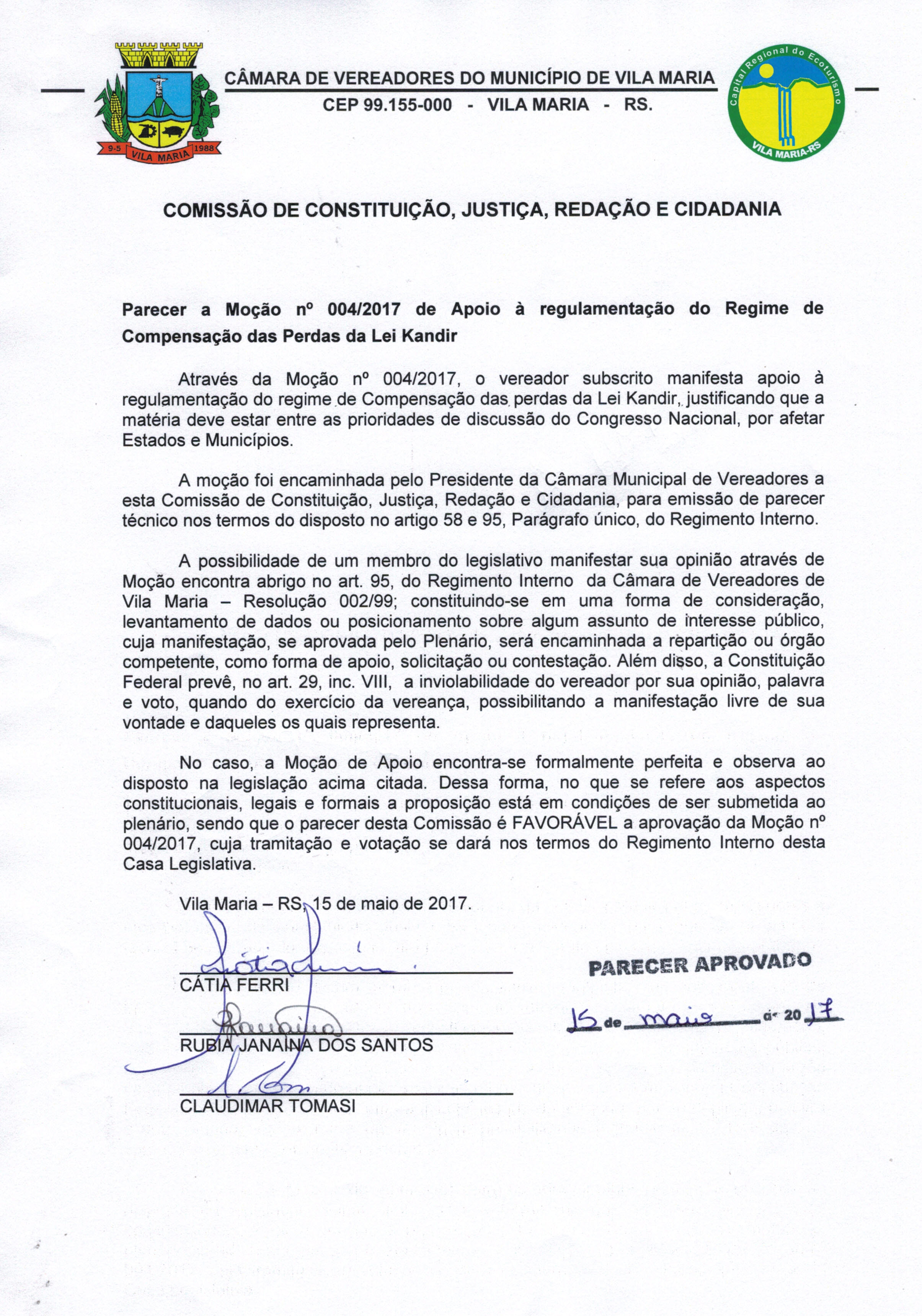 • Parecer e Moção 004/2017 de Apoio à regulamentação do Regime de Compensação das Perdas da Lei Kandir aprovadas por todos os vereadores.