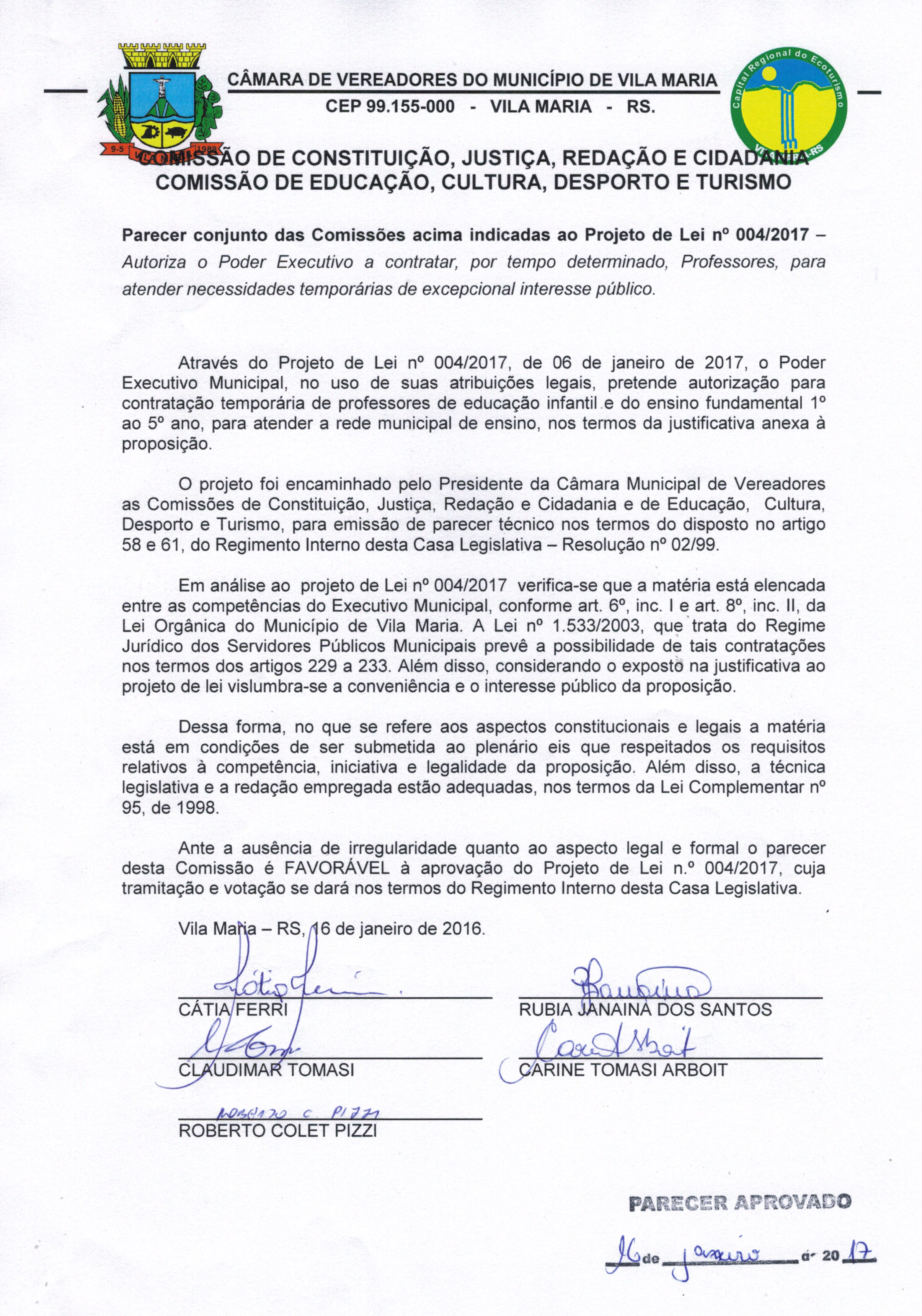 • O Parecer e o Projeto de Lei 004/2017 foram aprovados por todos os Vereadores na Sessão do dia 16/01/2017.