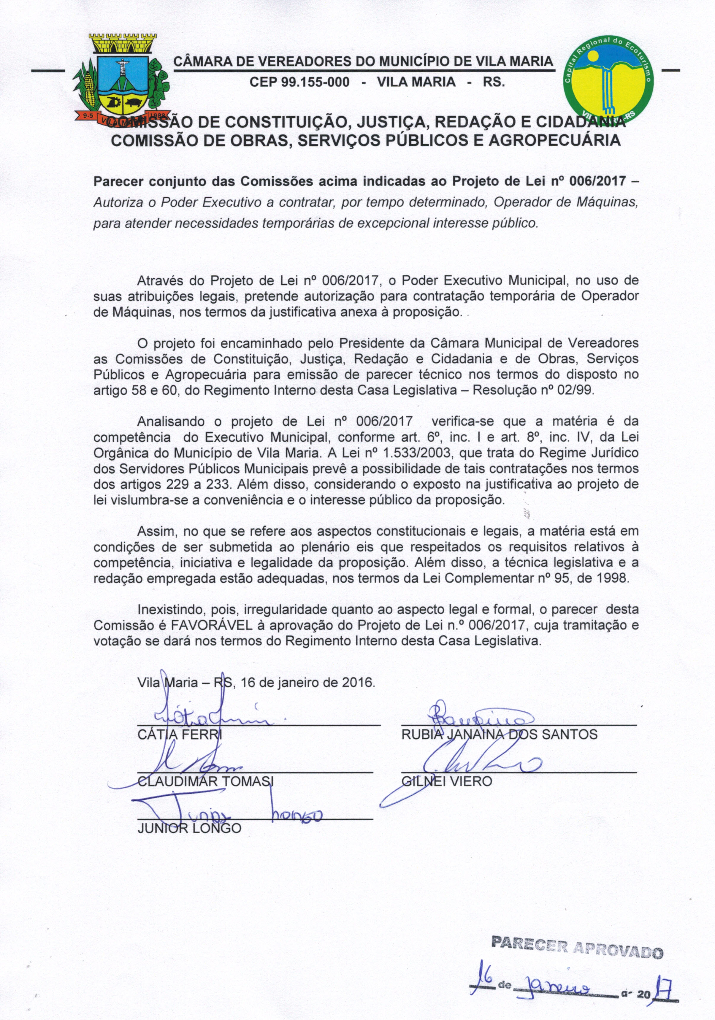 • O Parecer e o Projeto de Lei 006/2017 foram aprovados por todos os Vereadores na Sessão do dia 16/01/2017.
