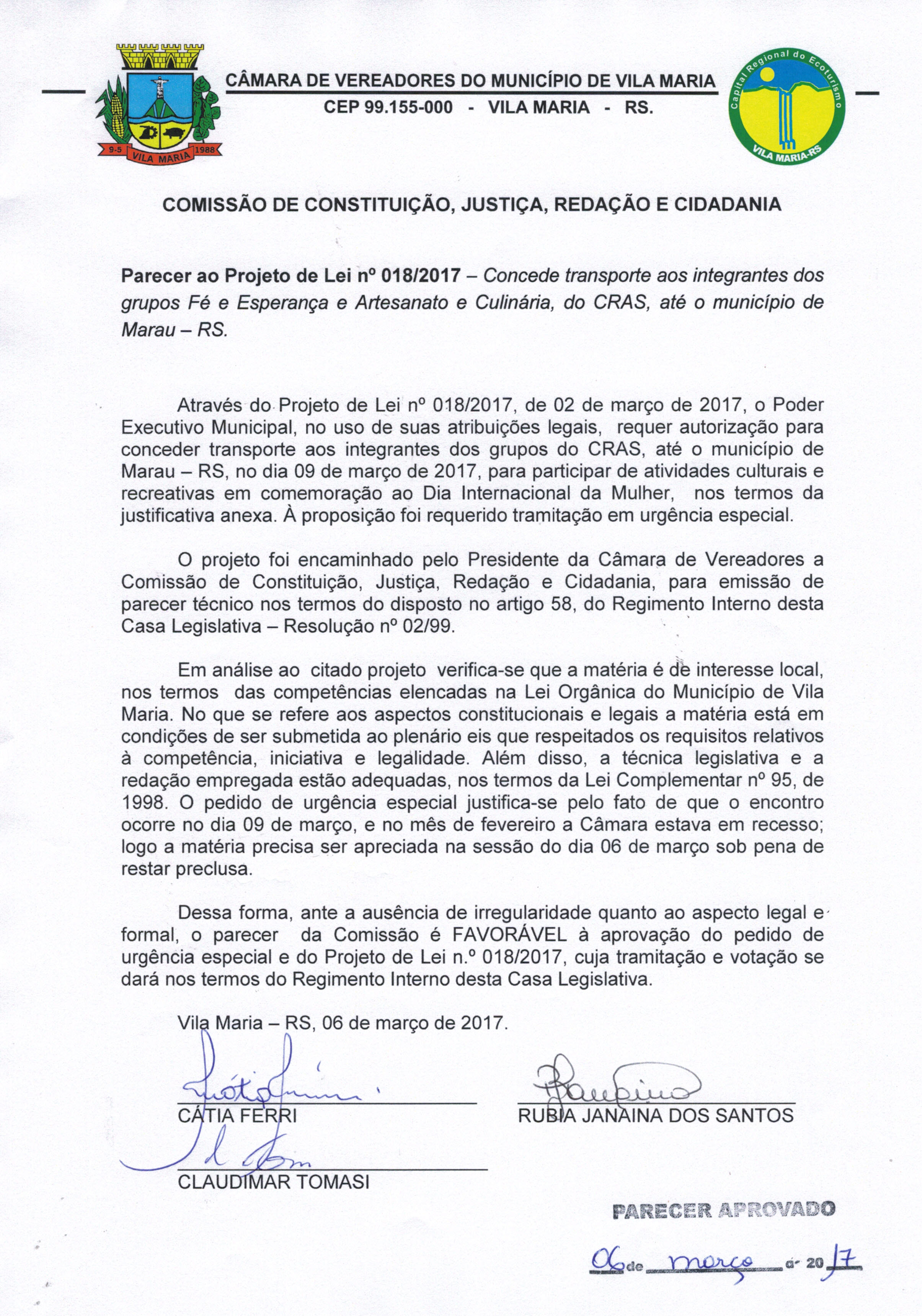 • O Parecer e o Projeto de Lei 018/2017 foram aprovados por todos os vereadores.