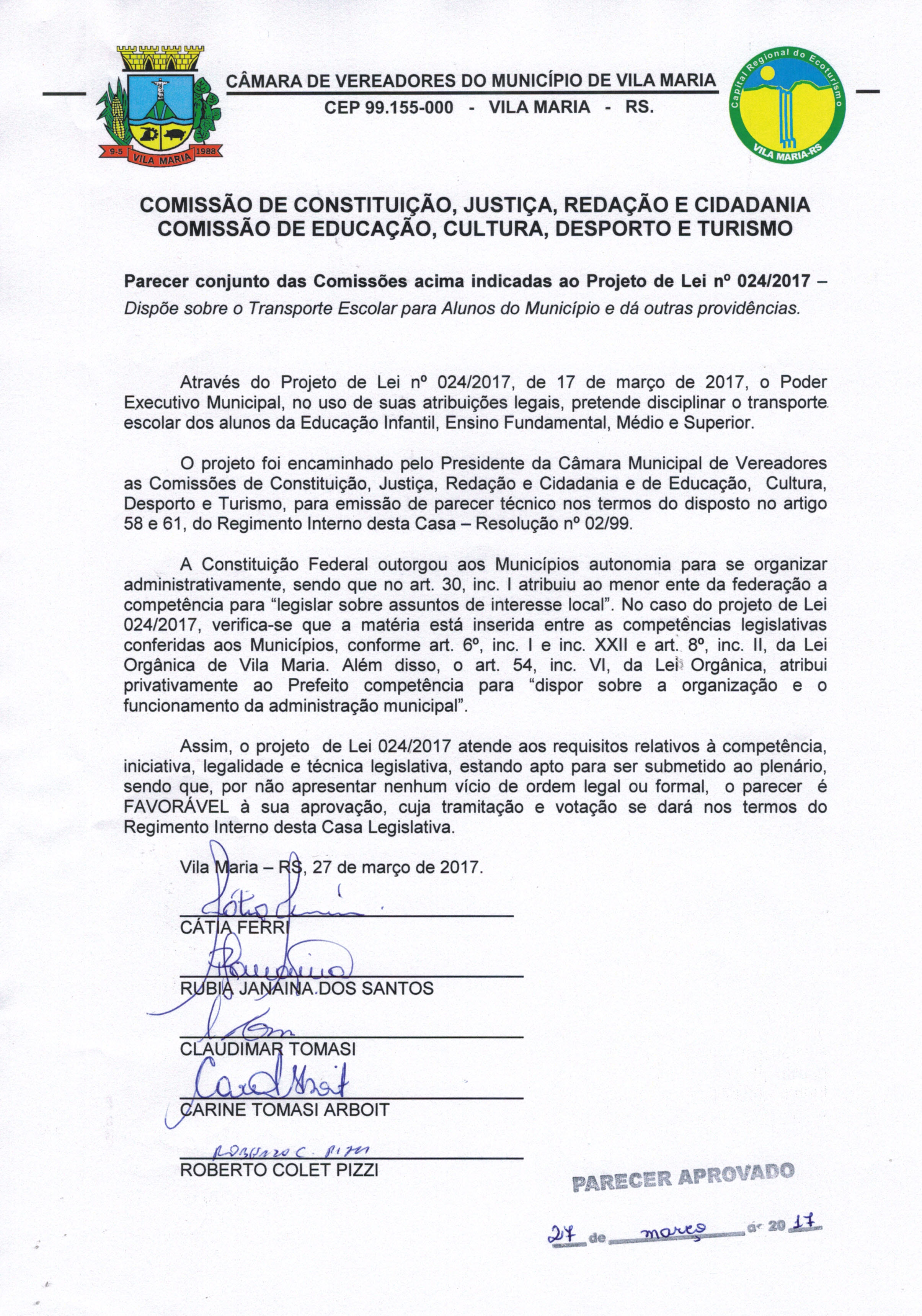 • O Parecer e o Projeto de Lei 024/2017 foram aprovados na sessão do dia 27/03/2017.