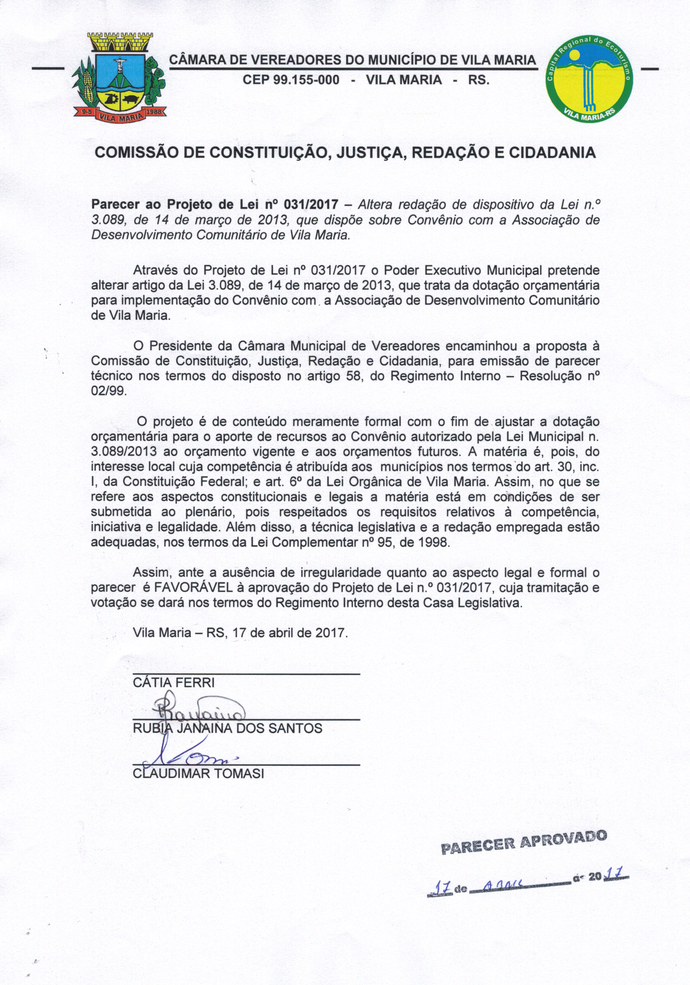 • Parecer e Projeto de Lei 031/2017 aprovados pelos vereadores presentes na sessão do dia 17/04/2017.