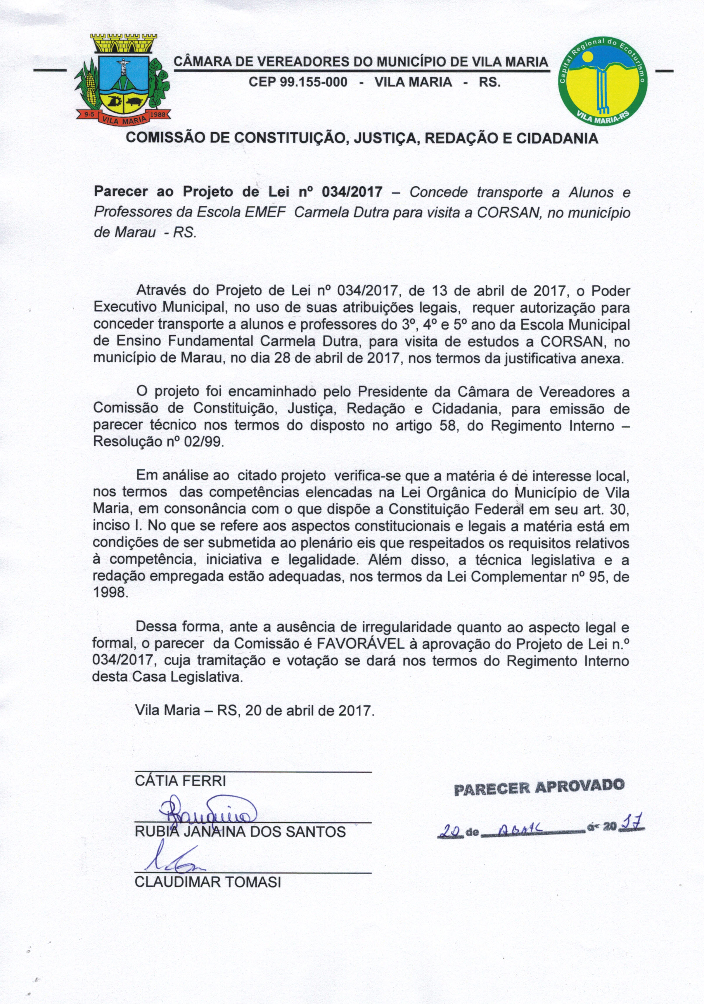 • O Parecer e o Projeto de Lei 034/2017 foram aprovados pelos vereadores.