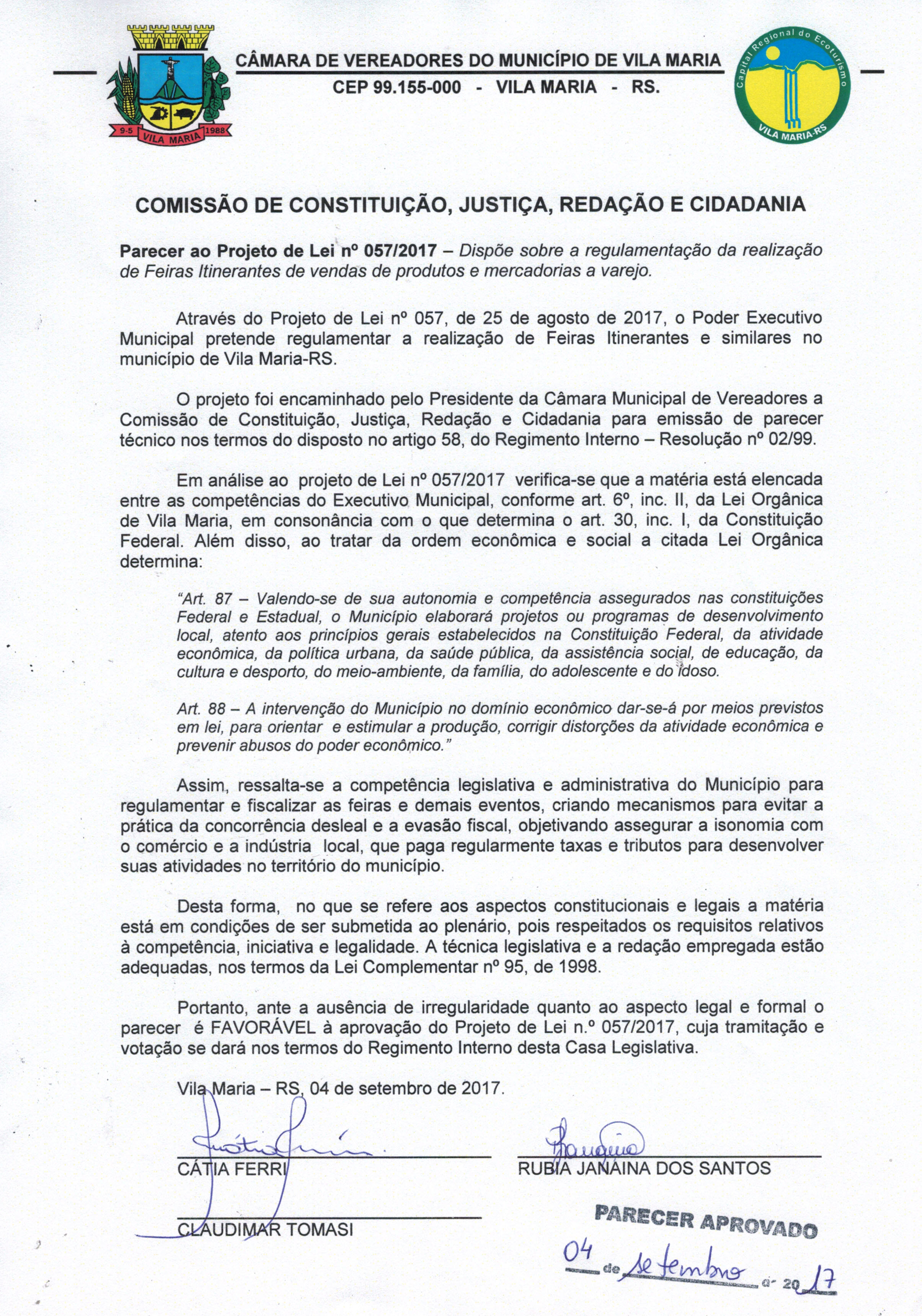 • O Parecer e o Projeto de Lei 057/2017 foram aprovados por todos os vereadores.