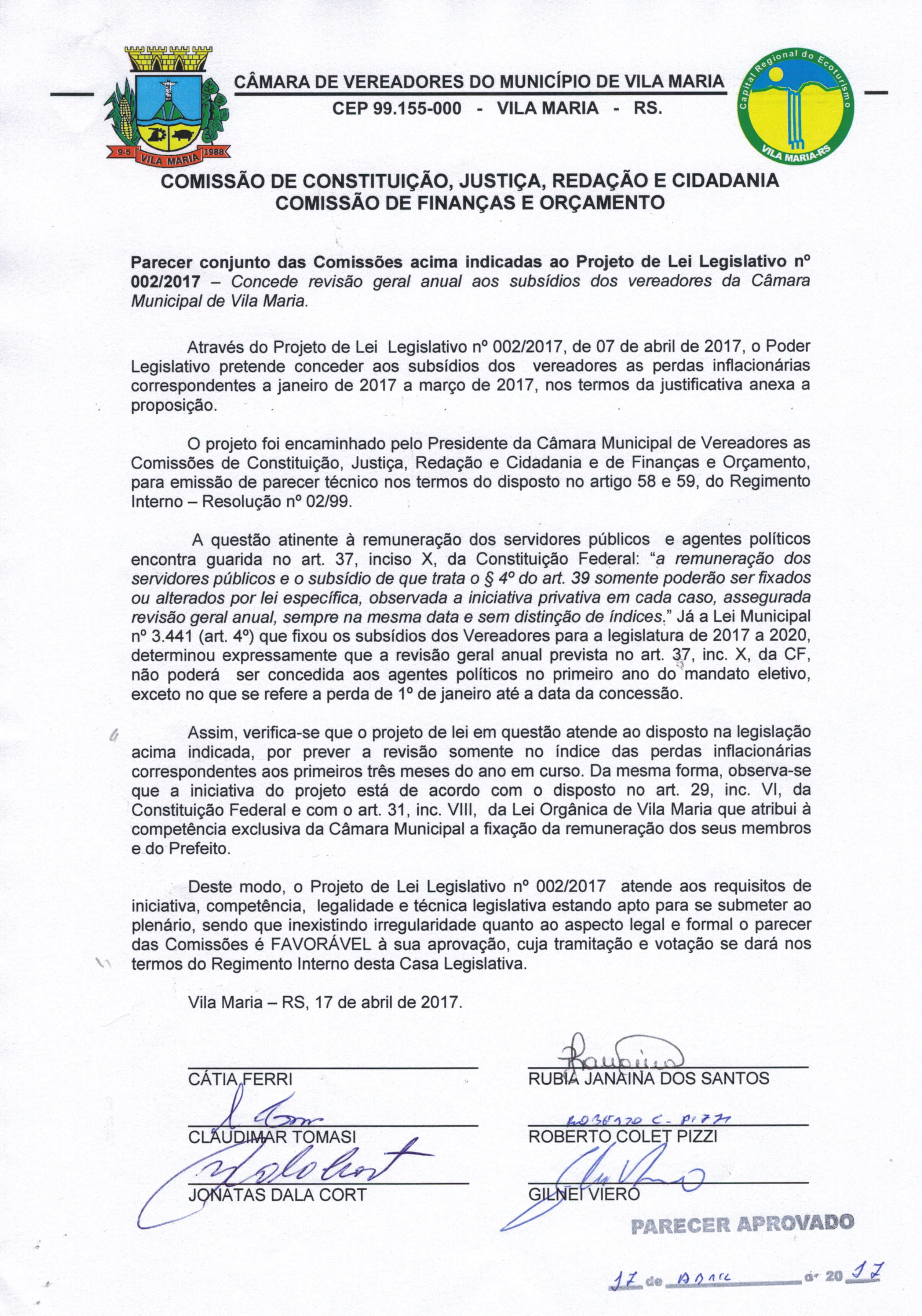 • Parecer e Projeto de Lei do Legislativo 002/2017 aprovados por todos os vereadores.