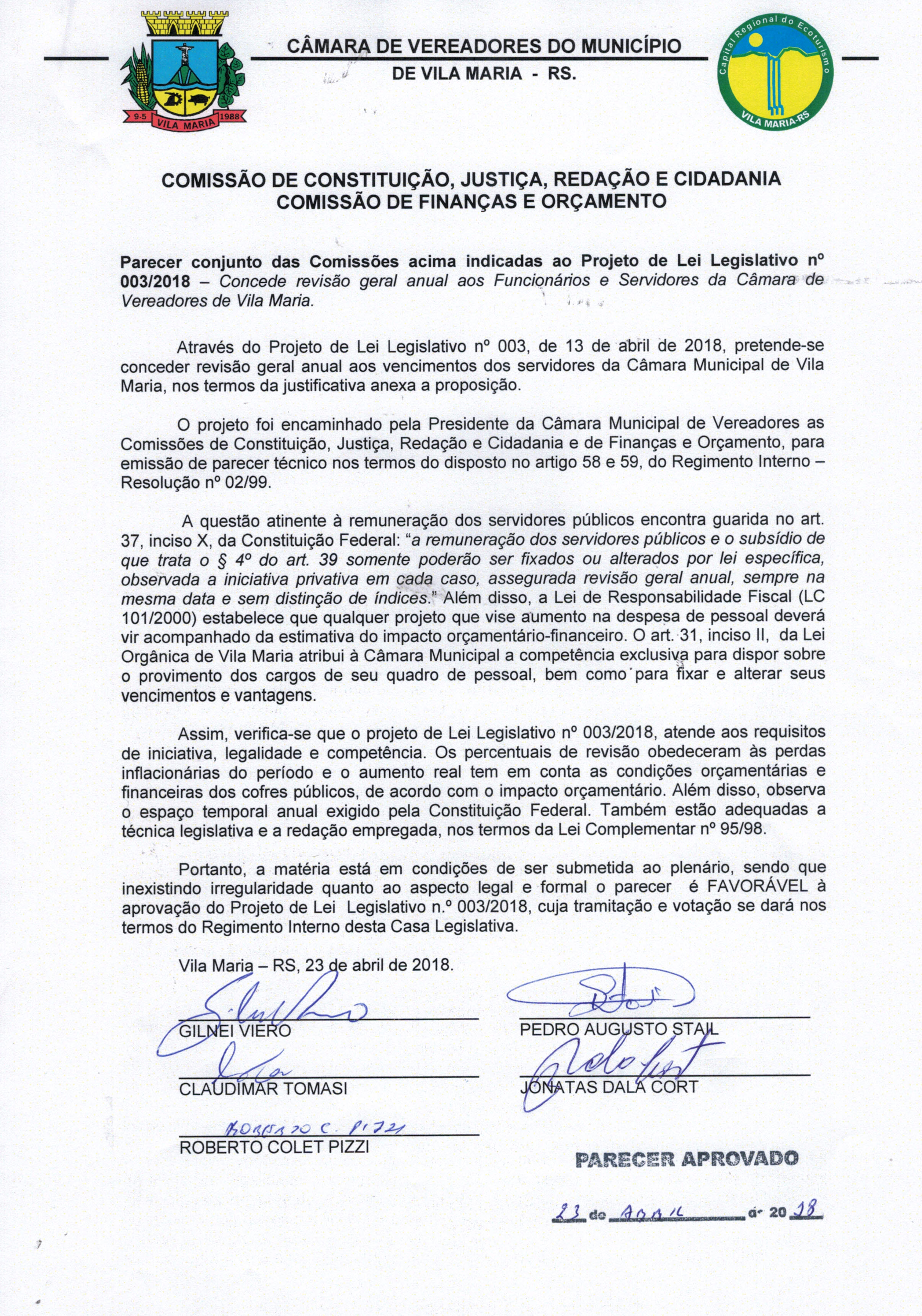 • O Parecer e o Projeto de Lei do Legislativo 003/2018 foram aprovados por todos os vereadores na sessão do dia 23/04/2018.