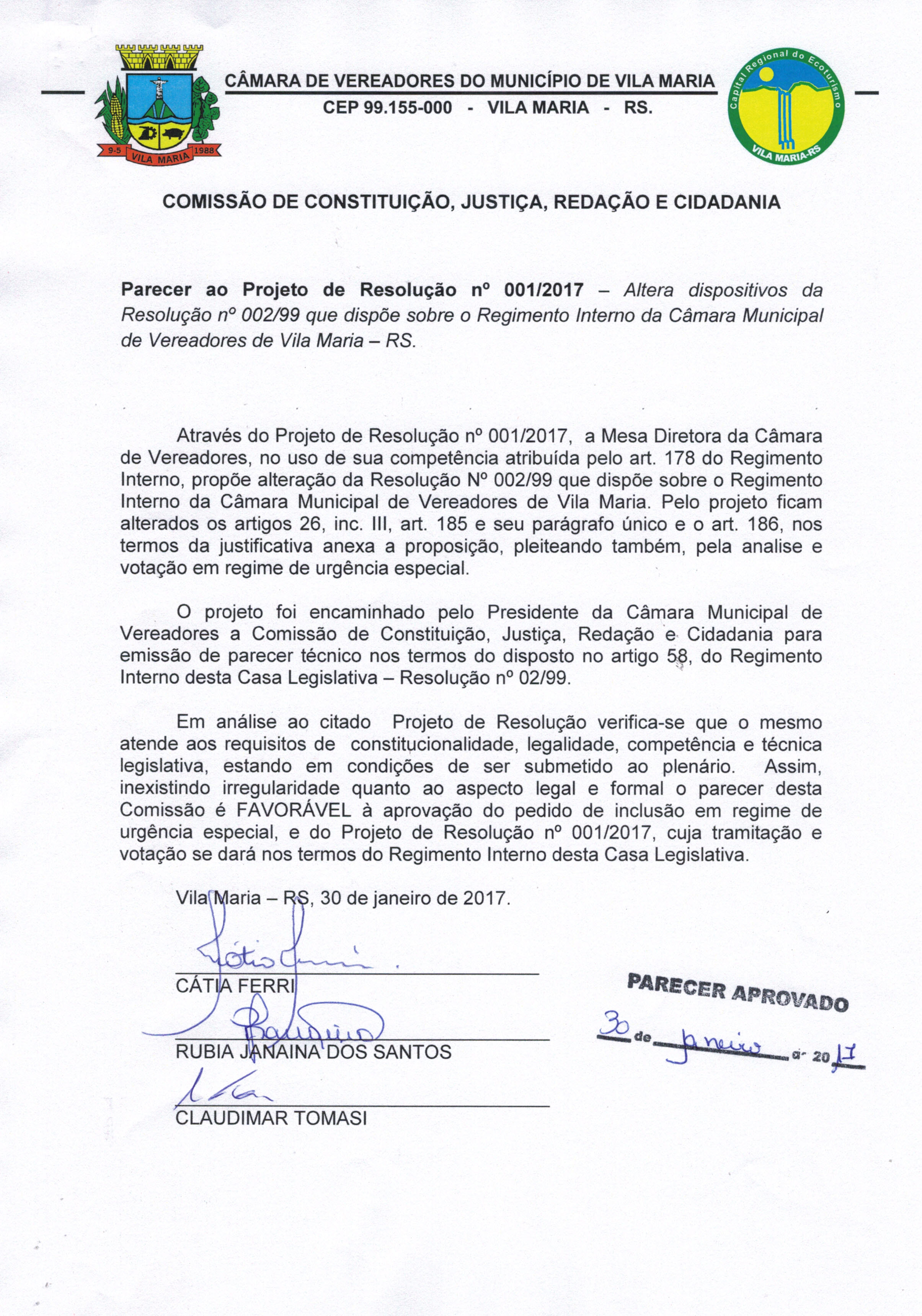 • O Parecer e o Projeto de Resolução 001/2017 foram aprovados pelos vereadores presentes na sessão do dia 30/01/2017.