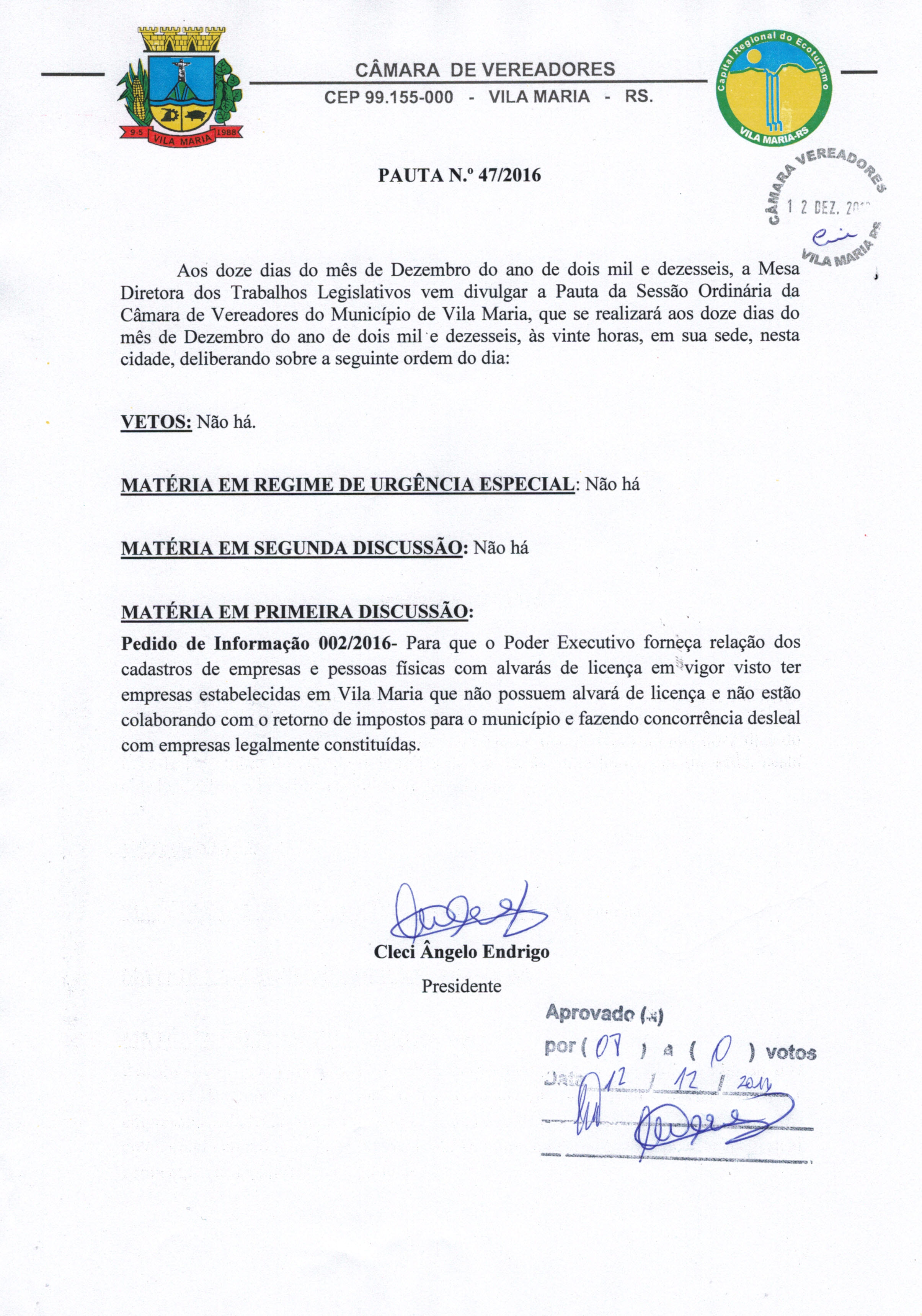 Pauta 047/2016, alterada e aprovada