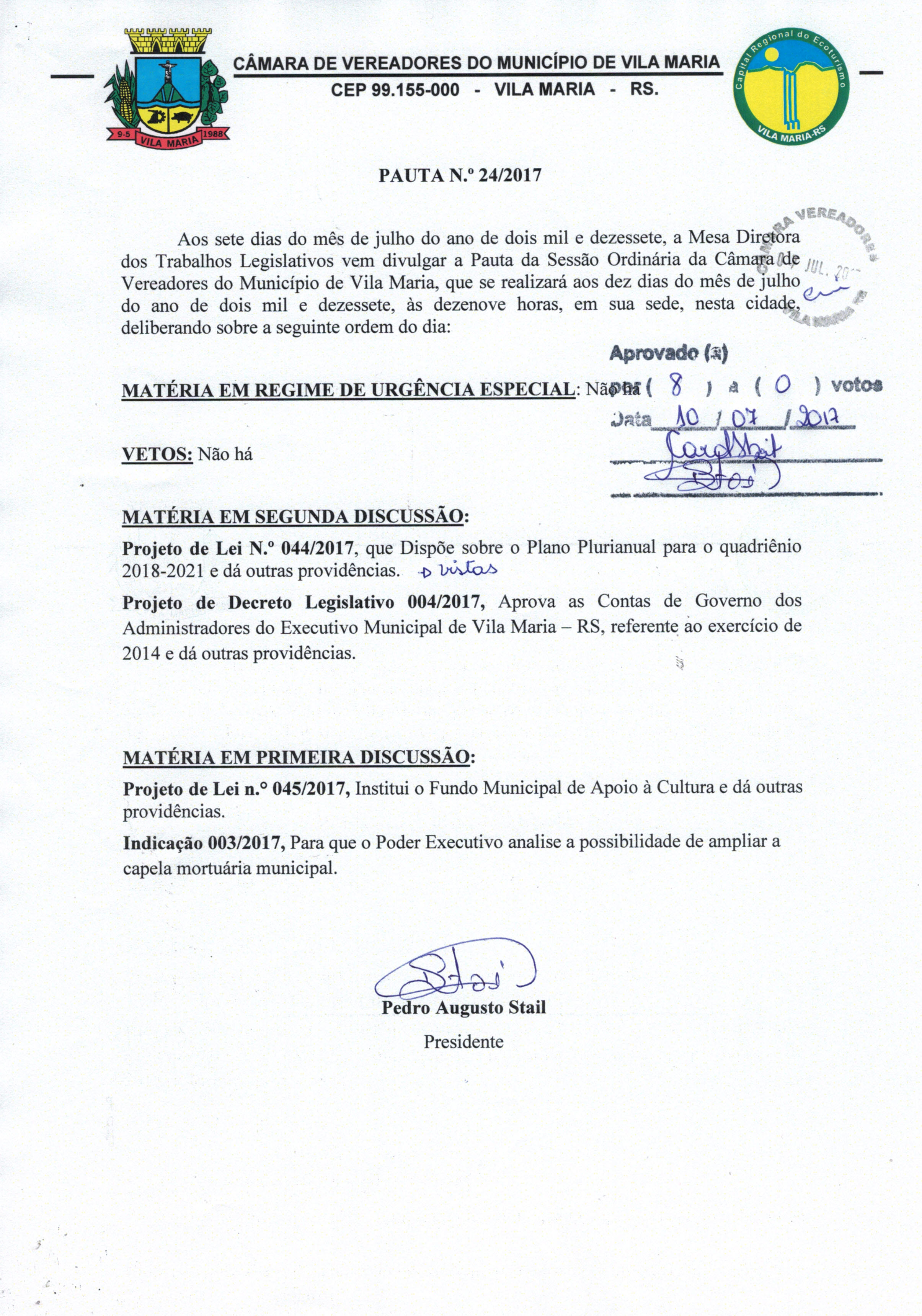 • A Pauta 24/2017 foi aprovada com vista do Projeto de Lei 044/2017.