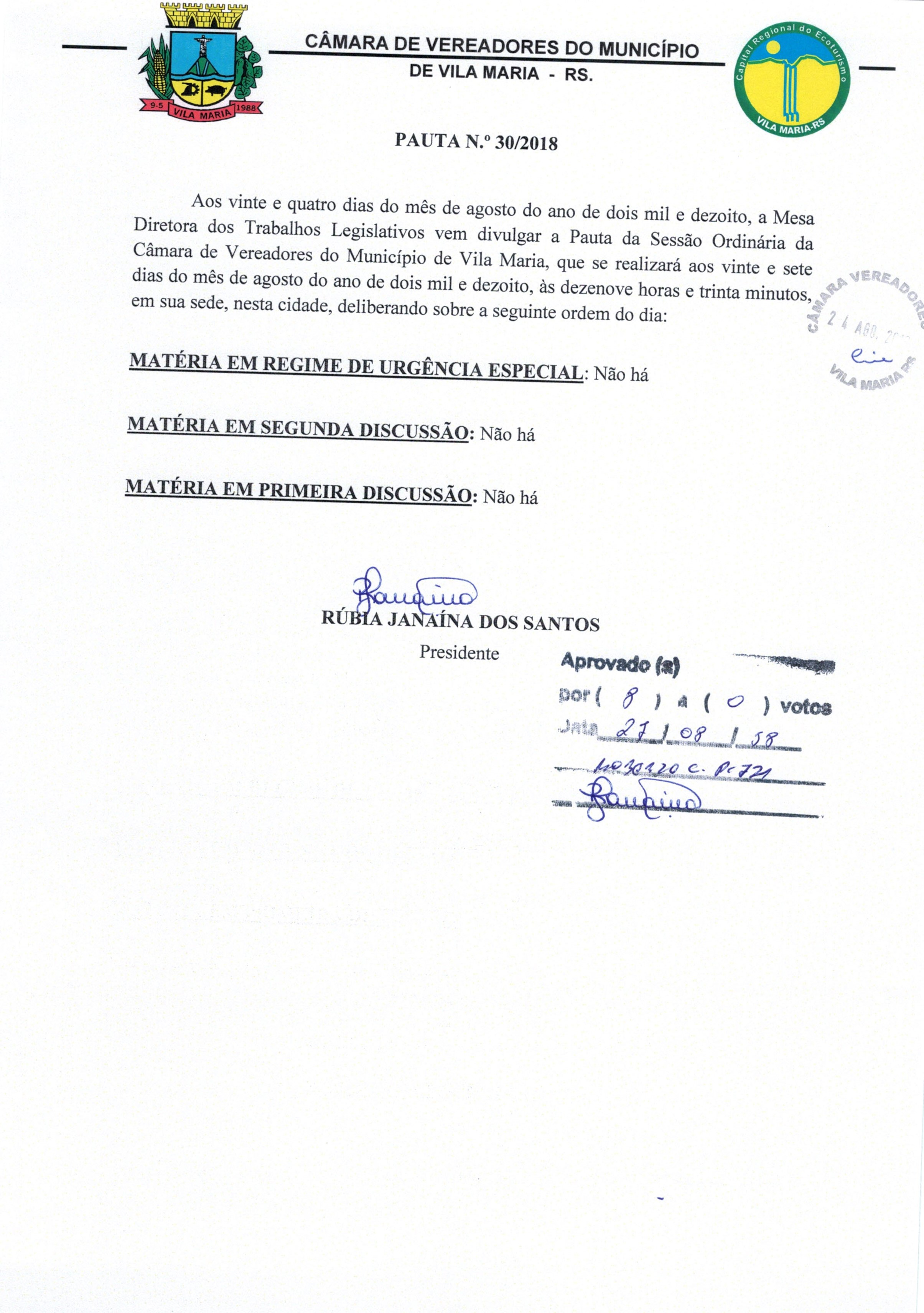 • A Pauta 30/2018 foi aprovada na sessão do dia 27/08/2018.